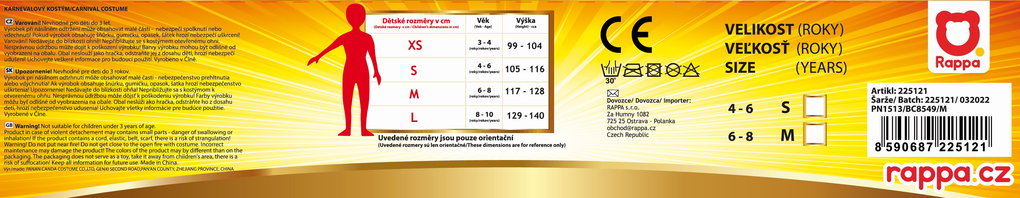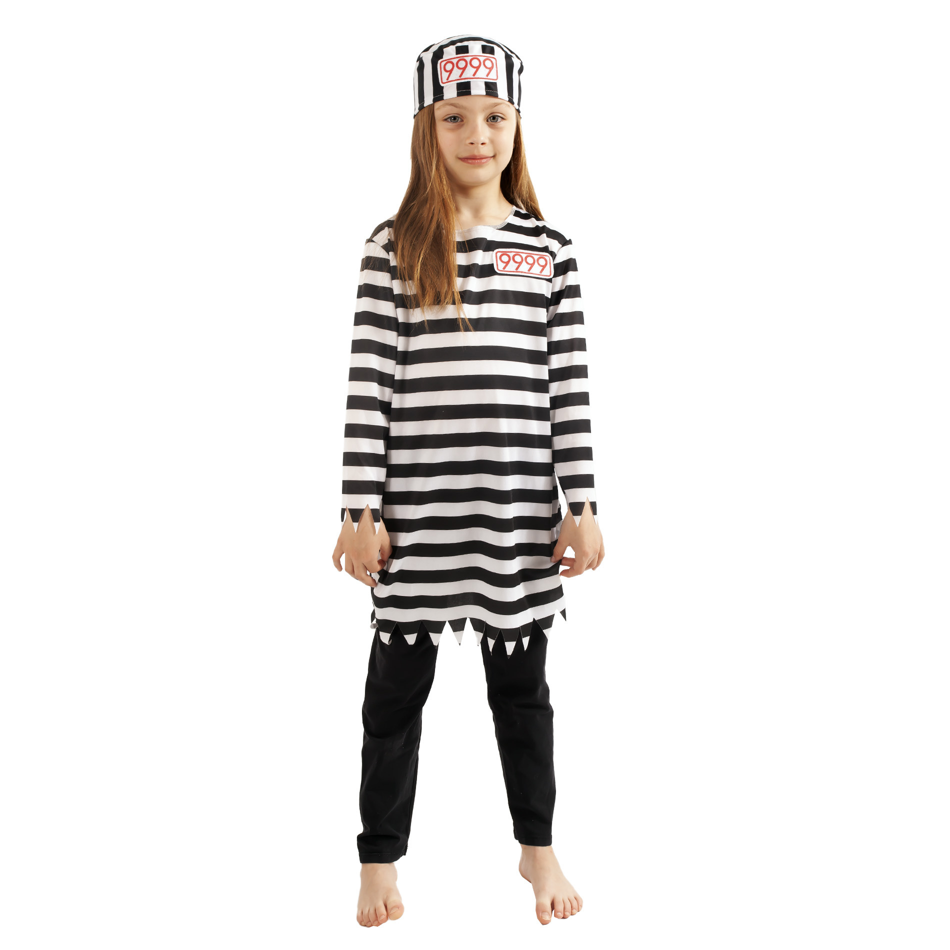 Pruhovaný karnevalový kostým vězeňkyně v typických bílo-černých barvách ve velikosti M je určen pro děvčata ve věku 6-8 let (117-128 cm). Kostým obsahuje dlouhé triko a čepici s číslem vězně.