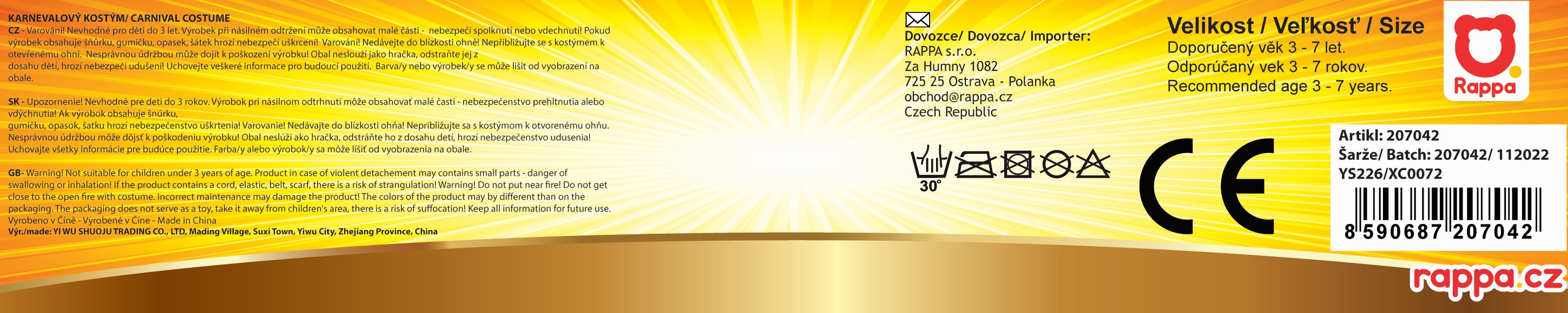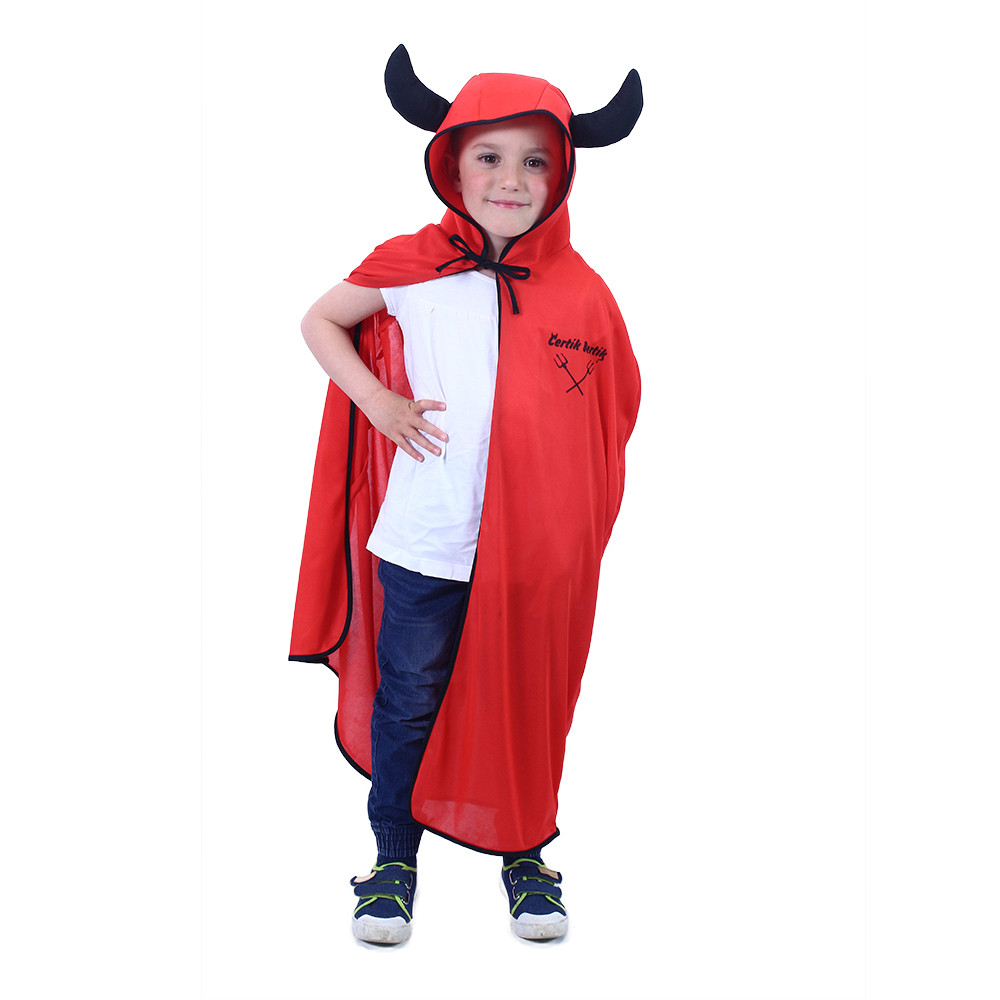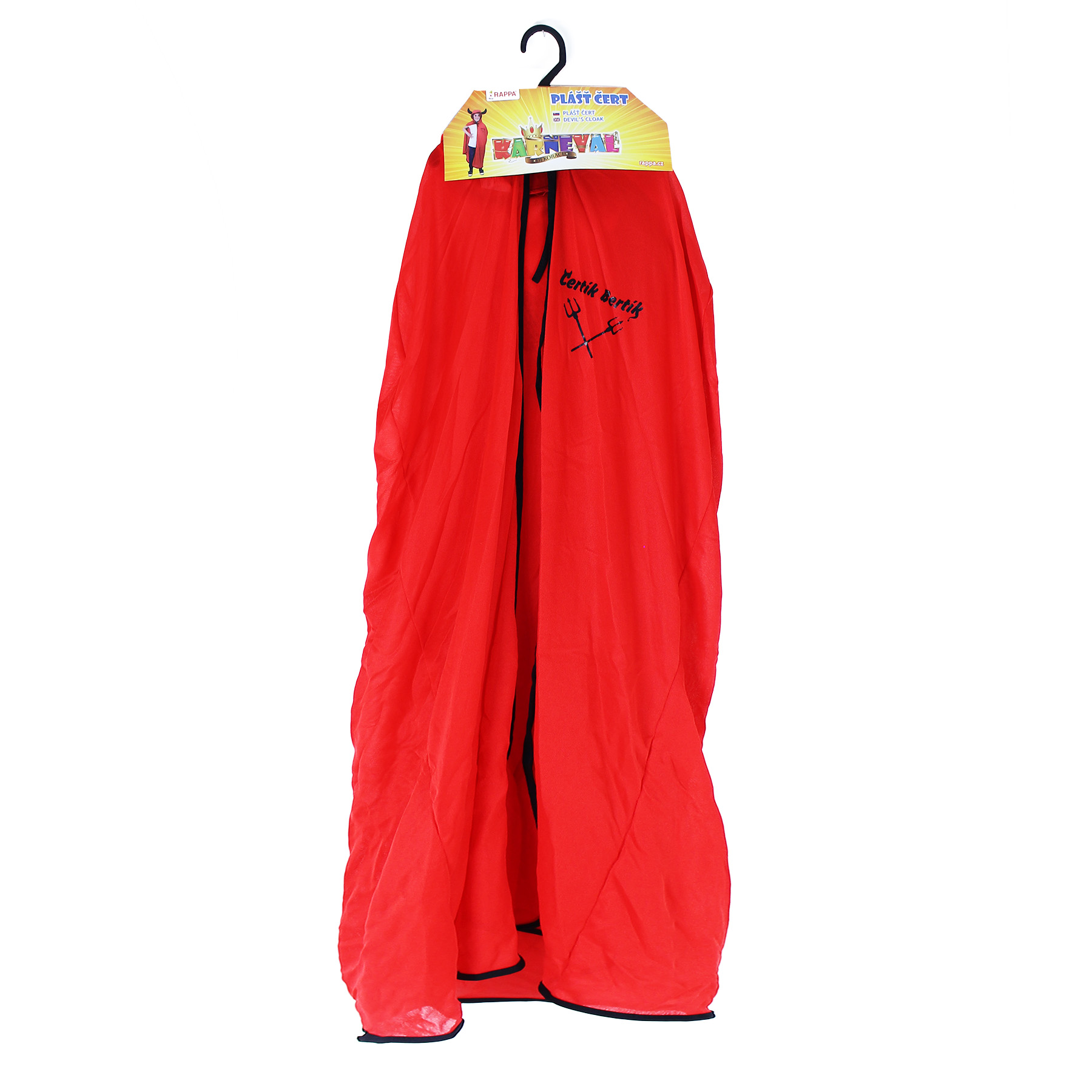 Karnevalový plášť čerta v červeno-černé barvě a v univerzální velikosti je určen pro děti ve věkovém rozmezí 3-10 let (104-146 cm). Balení obsahuje plášť s kapucí, na které jsou přišity rohy. Délka pláště je cca 104 cm.