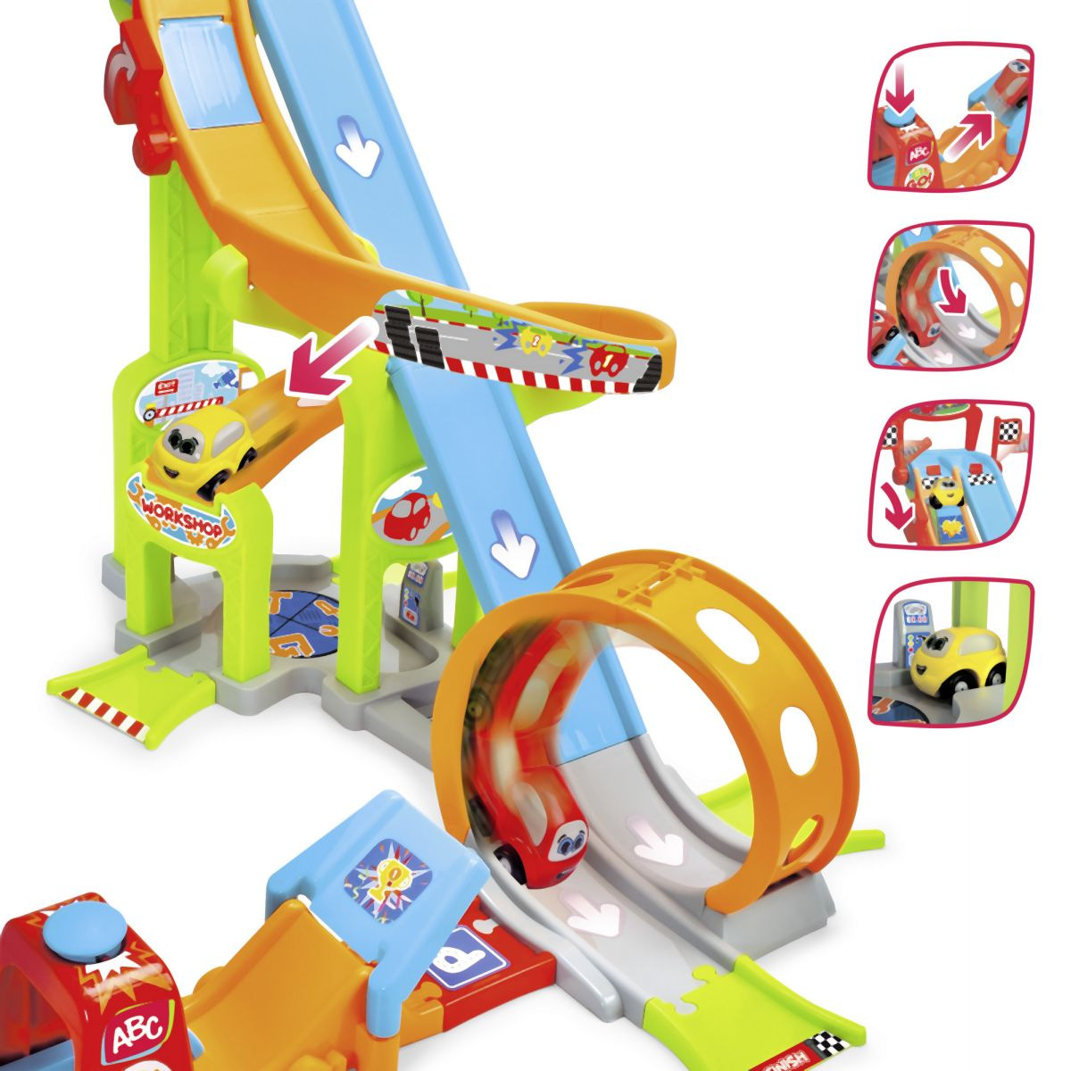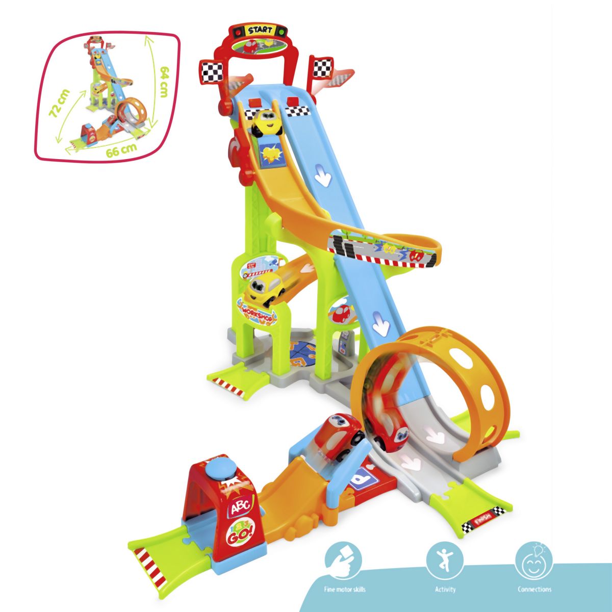 Hrací set dráha Mega Jump s autíčky pro nejmenší. Startovní boxy, vystřelovací funkce, looping, dílna, parkoviště, závora a další funkce. Rozměry dráhy: 66 x 72 x 64 cm. 2 autíčka délky 7 cm součástí.