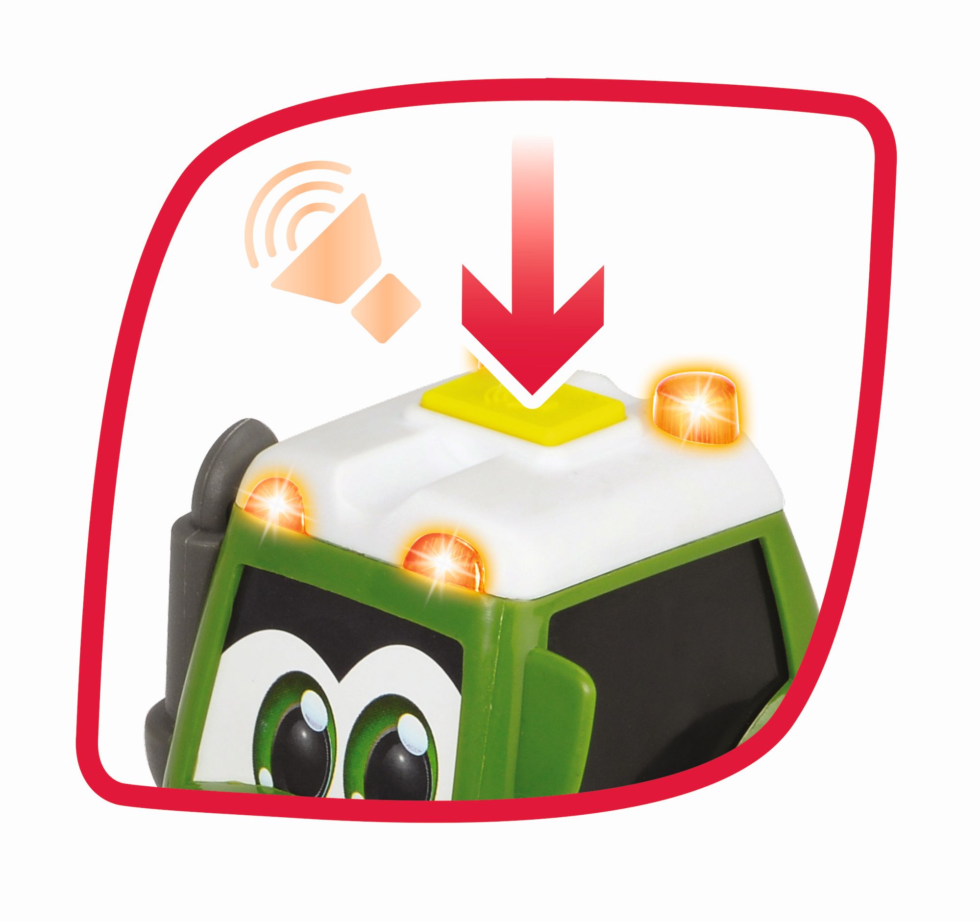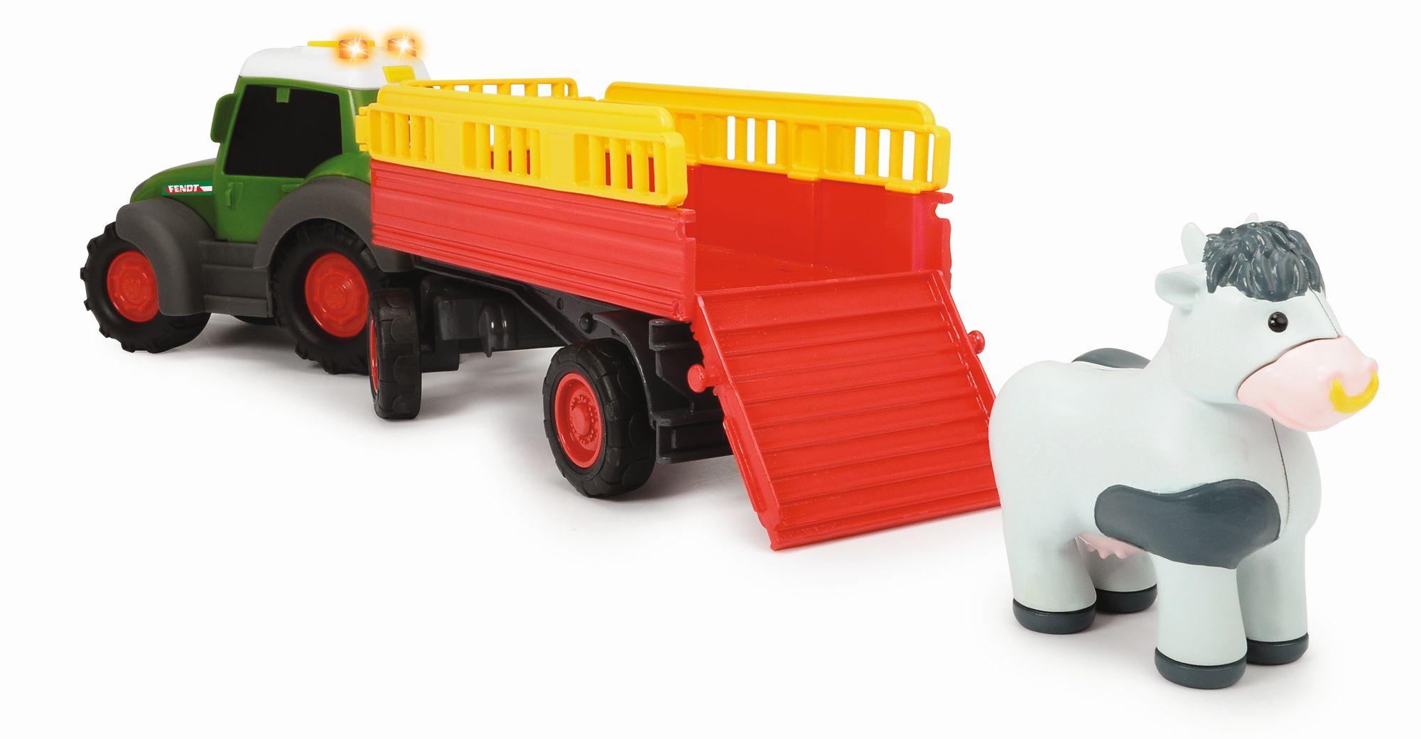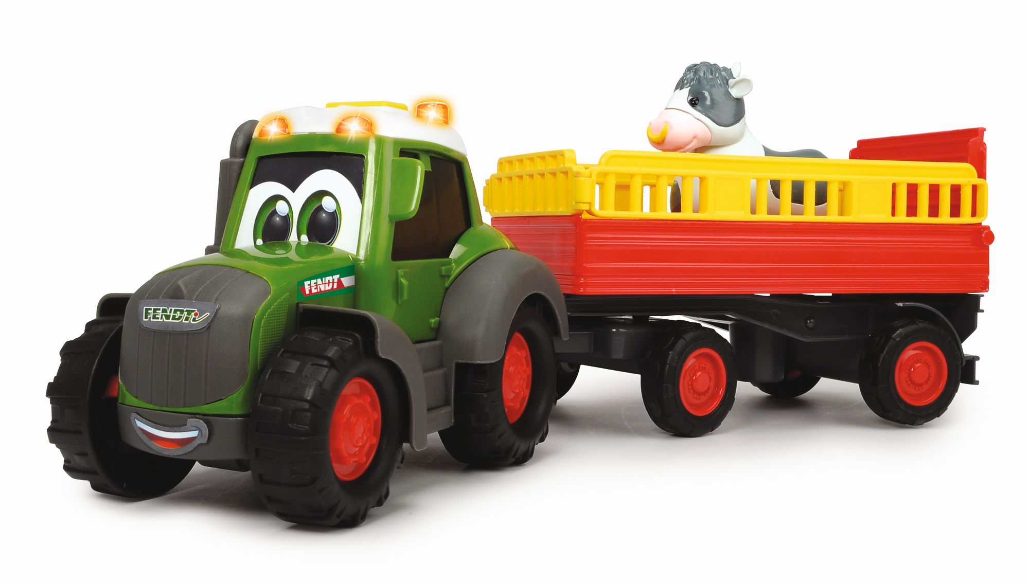 Traktor Fendti s očíčky pro nejmenší, na volnoběh, se světelnými a zvukovými efekty a přívěsem s kravičkou. Délka 30 cm.