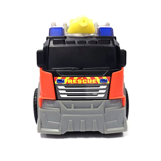 Hasičské auto na volnoběh, světelný a zvukový efekt. Stříkačka na vodu manuální, pohyblivý žebřík. Délka auta 15 cm.