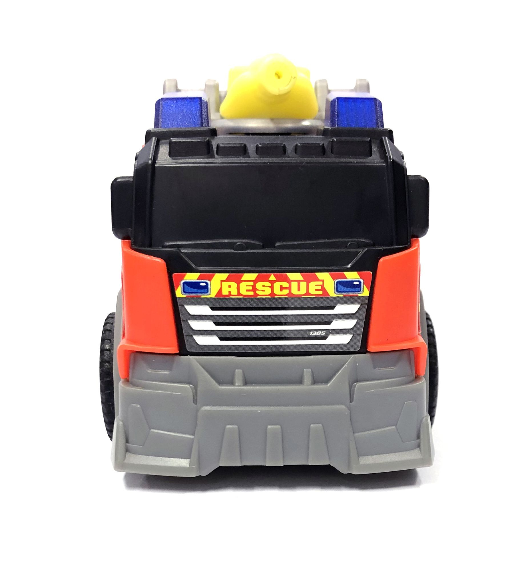 Hasičské auto na volnoběh, světelný a zvukový efekt. Stříkačka na vodu manuální, pohyblivý žebřík. Délka auta 15 cm.