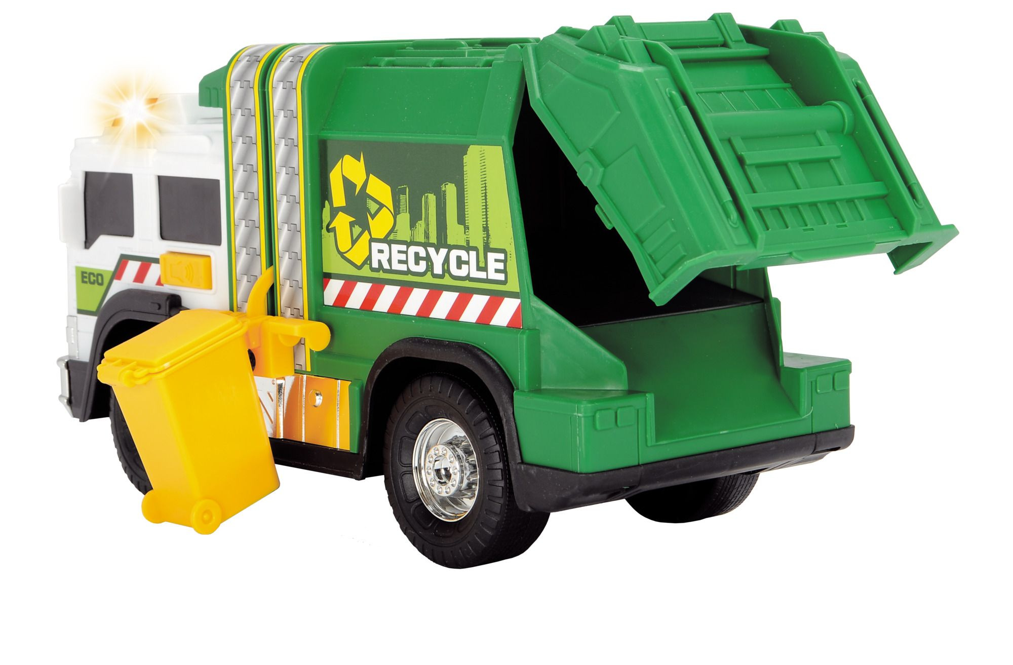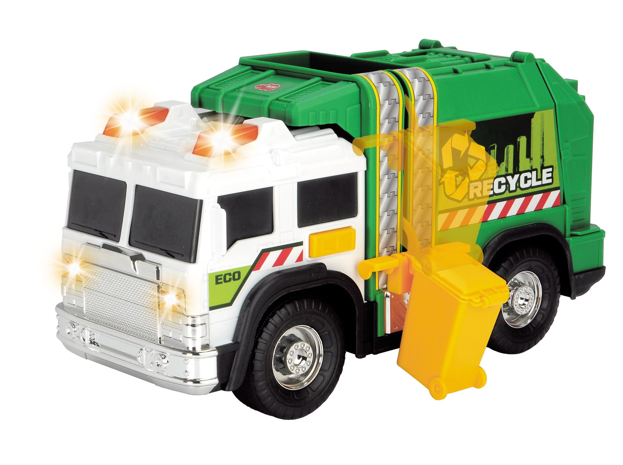 Popelářské auto zelené na volnoběh, s manuální funkcí zvedání popelnice. Zvukové a světelné efekty, otevírací zadní panel. Popelnice součástí. Pochromované díly. Délka 30 cm.