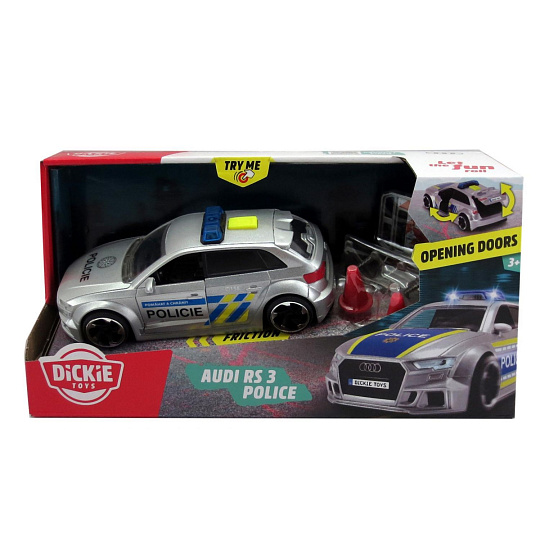Policejní auto Audi RS3 na setrvačník, se světelnými a zvukovými efekty a otevíracími dveřmi. Příslušenství - zastavovací pás, dopravní kužely, zábrana. Velikost 15 cm, měřítko 1:32. Česká verze.