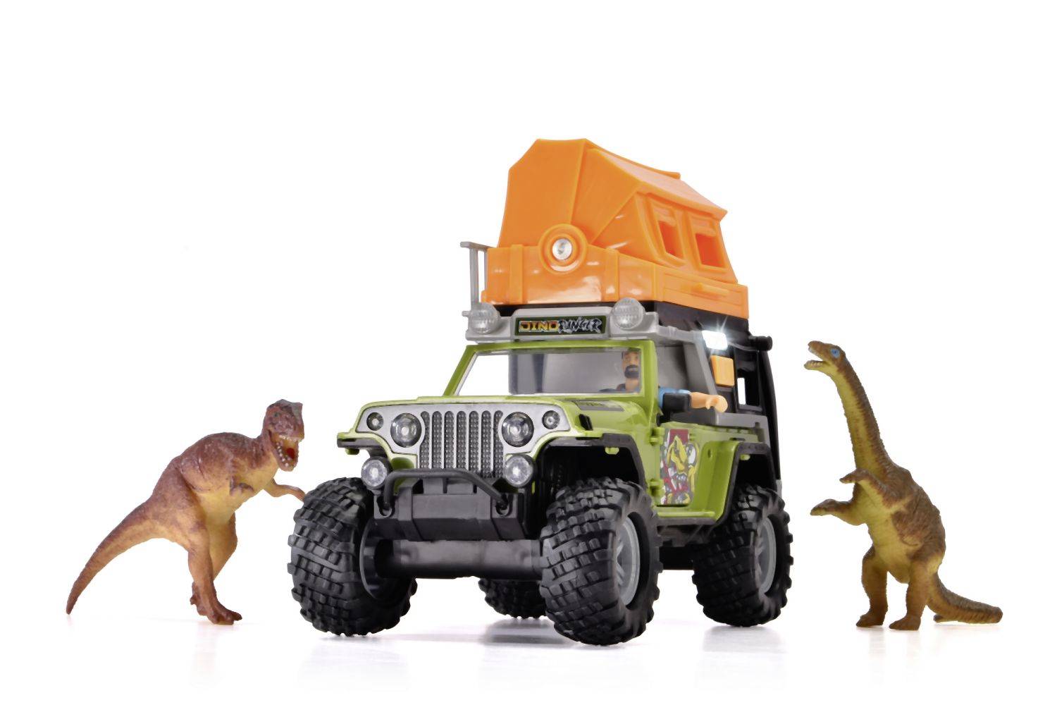 Auto Jeep na volnoběh s stanem na střeše pro kempování a s žebříkem. Otevírací dveře, zvukové a světelné efekty, s figurkou a 2 dinosaury, měkké pneumatiky. Délka 23 cm.