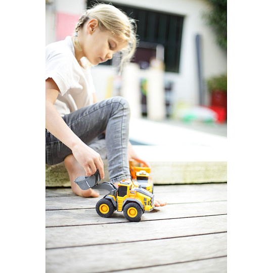 Stavební kolový nakladač v licenci Volvo na volnoběh, se světelnými a zvukovými efekty, manuálně pohyblivá radlice. Délka 23 cm.