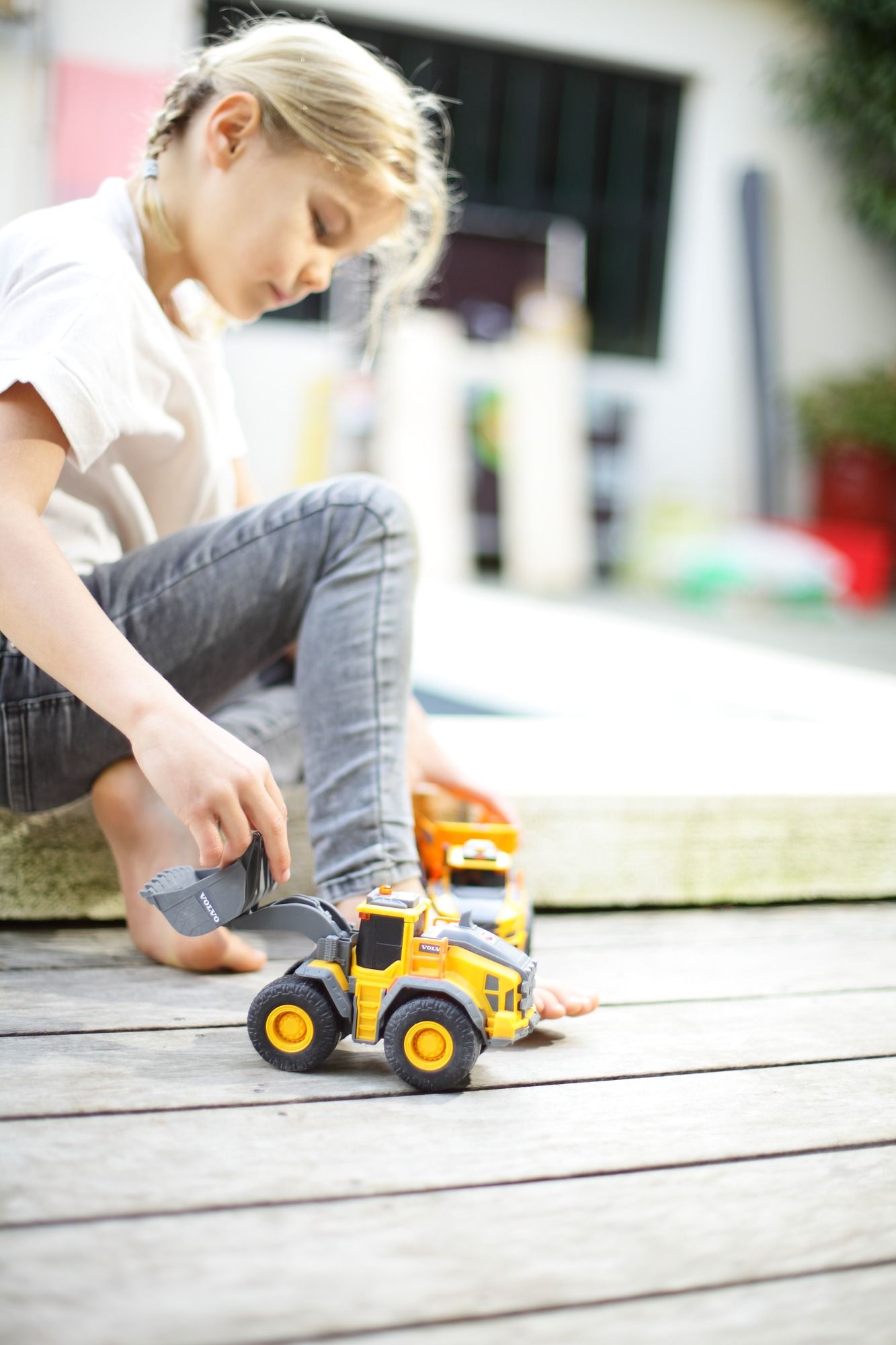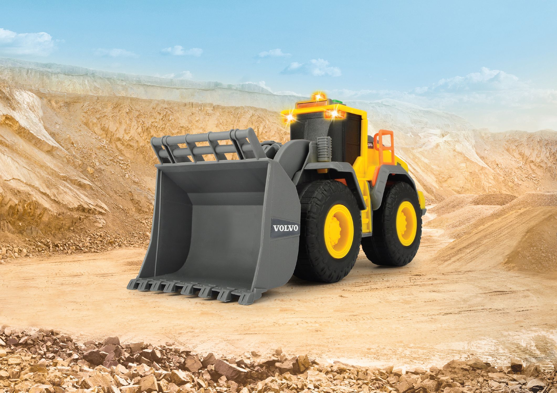 Stavební kolový nakladač v licenci Volvo na volnoběh, se světelnými a zvukovými efekty, manuálně pohyblivá radlice. Délka 23 cm.