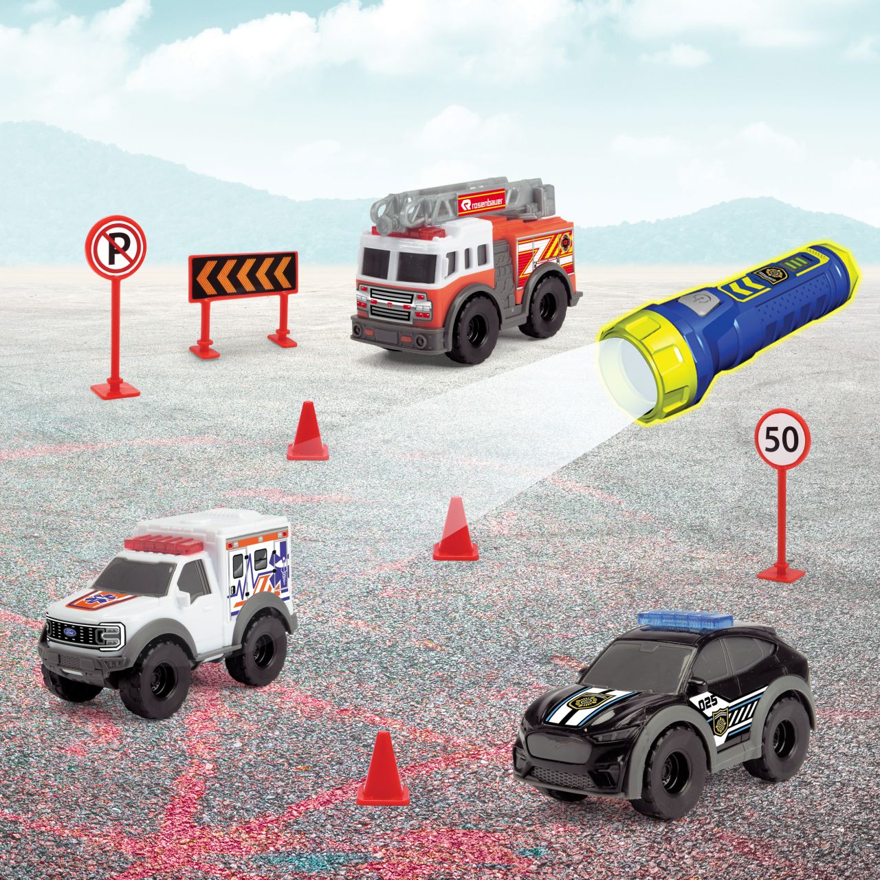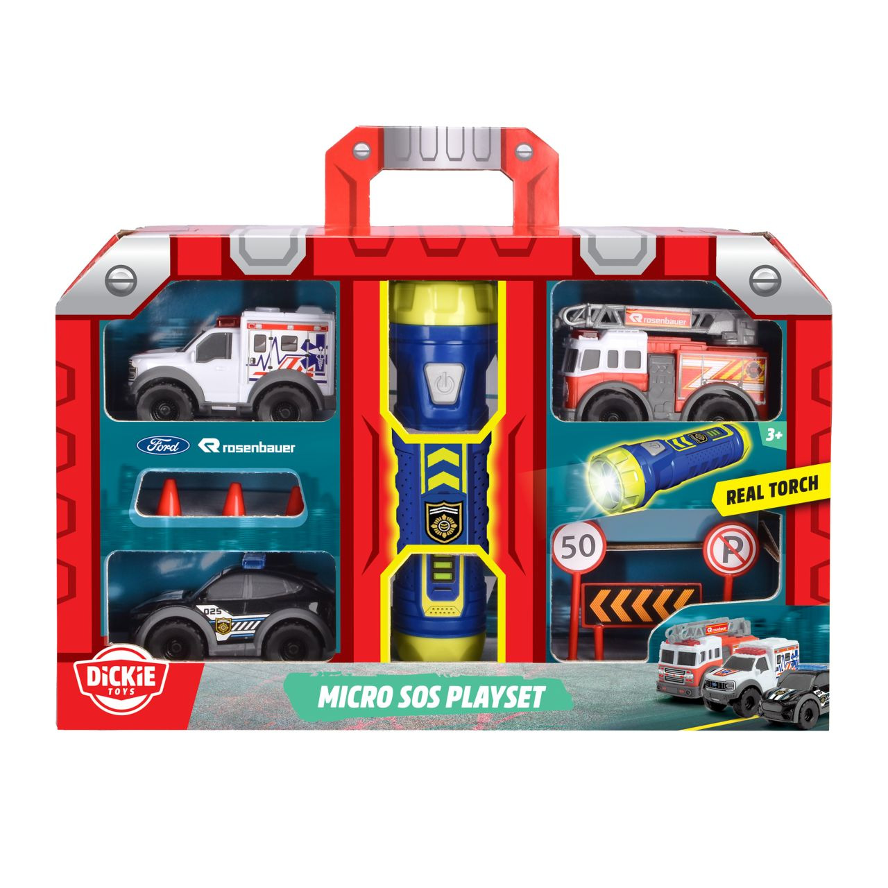 Set 3 ks mini dopravních záchranářských prostředků na volnoběh - hasičské auto, policie a ambulance. Součástí jsou dopravní značky a baterka, která má 3 světelné funkce. Výška baterky 10 cm. Rozměry kufříku: 28 x 18 x 7 cm. Délka auta cca 8 cm.