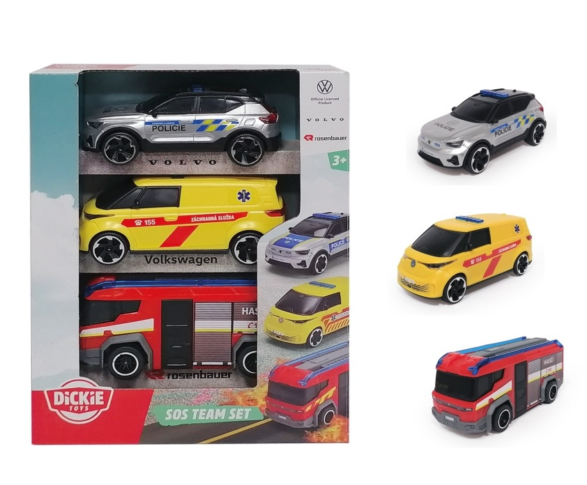 Set 3 ks dopravních záchranářských prostředků na volnoběh - hasičské auto Rosenbauer Penta, policie Volvo EX40, ambulance Volkswagen . V měřítku 1:36. Délka 15,5 cm.