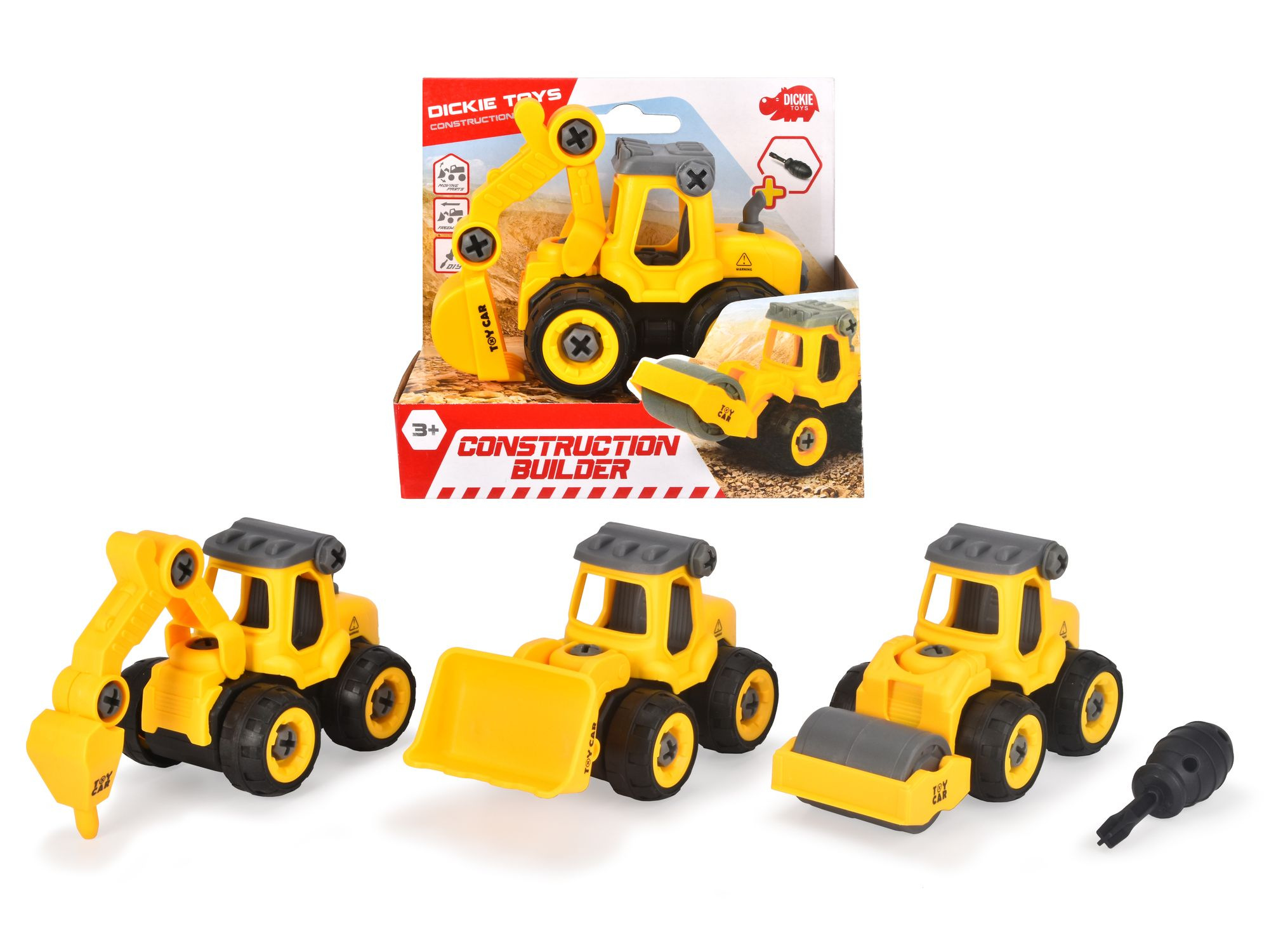 Žluté stavební autíčko na volnoběh, součástí šroubovák. 4 druhy. Velikost 12,5 cm.