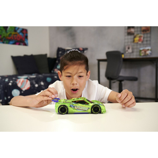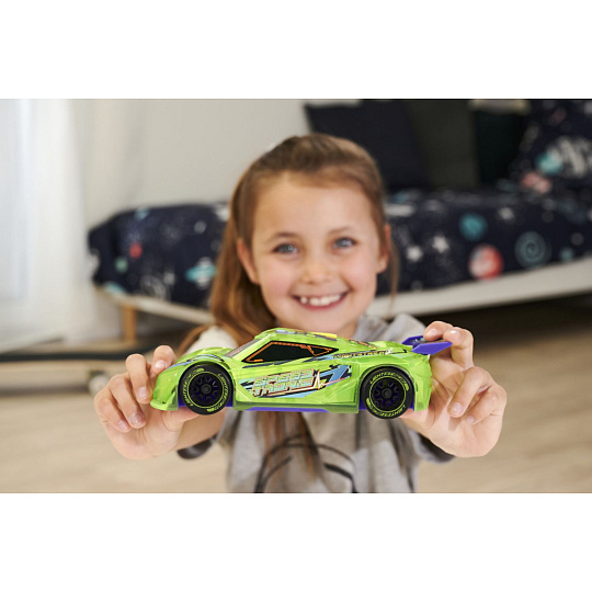 Závodní auto na setrvačník, mění barvy, zvuková funkce. Délka 20 cm.