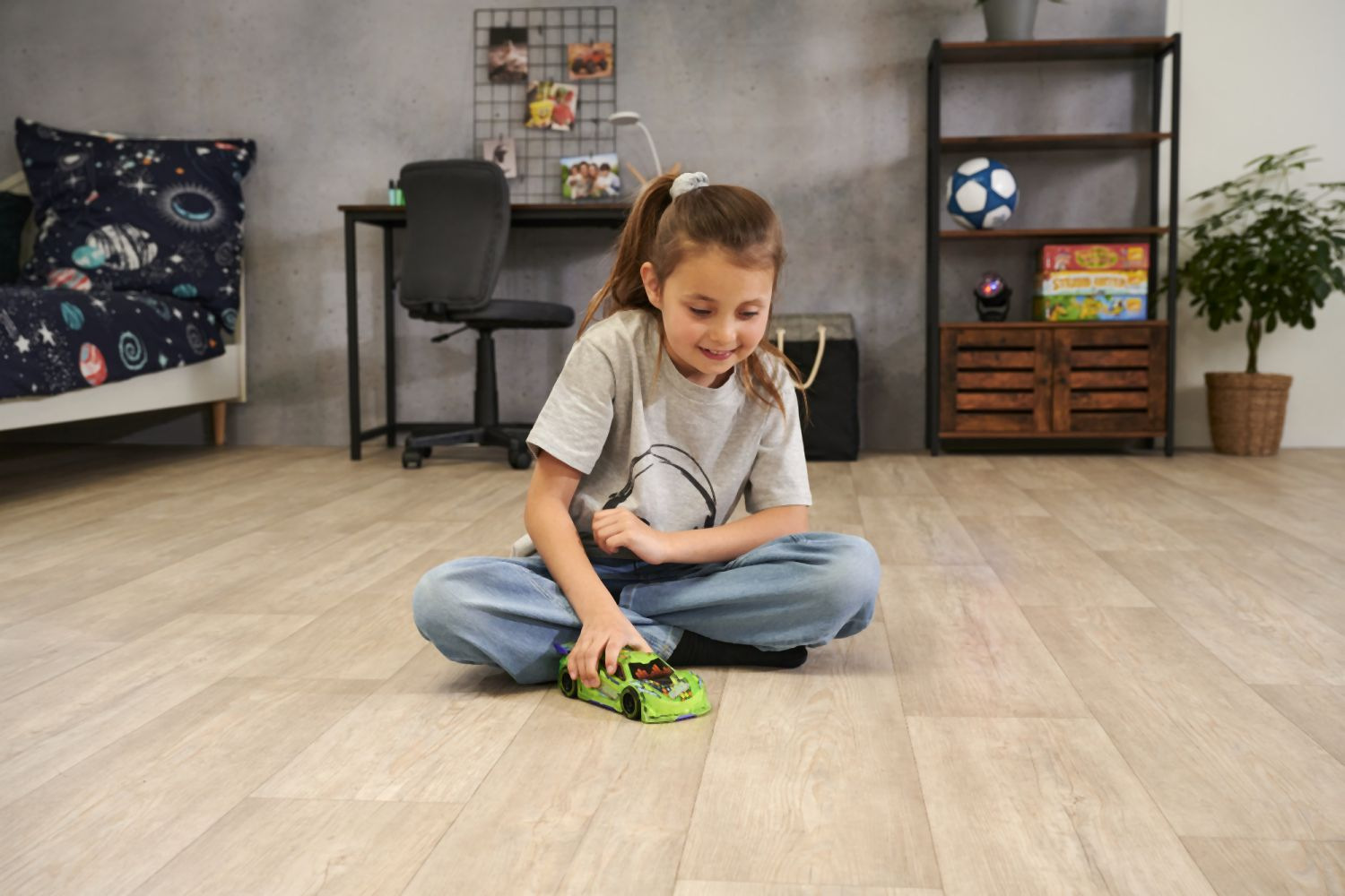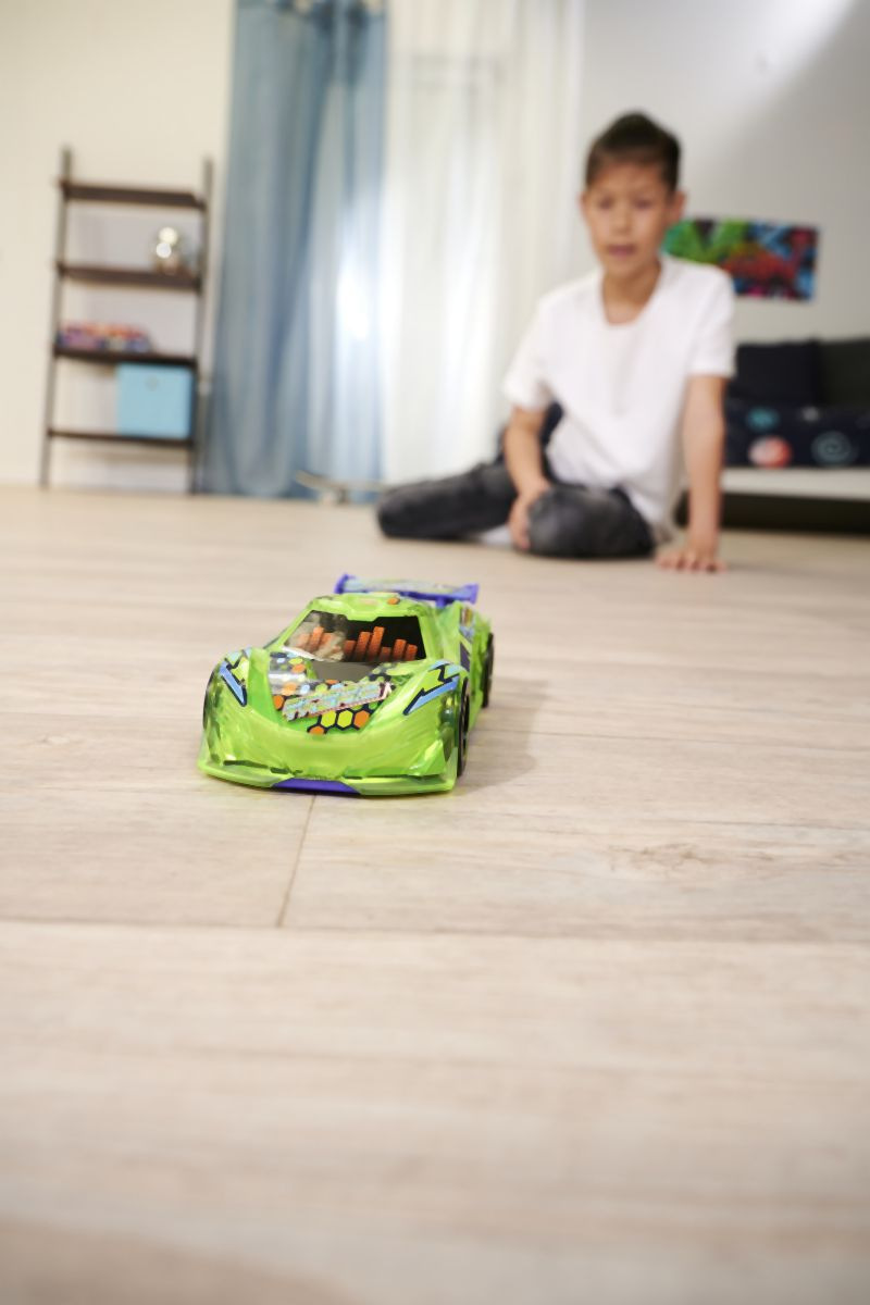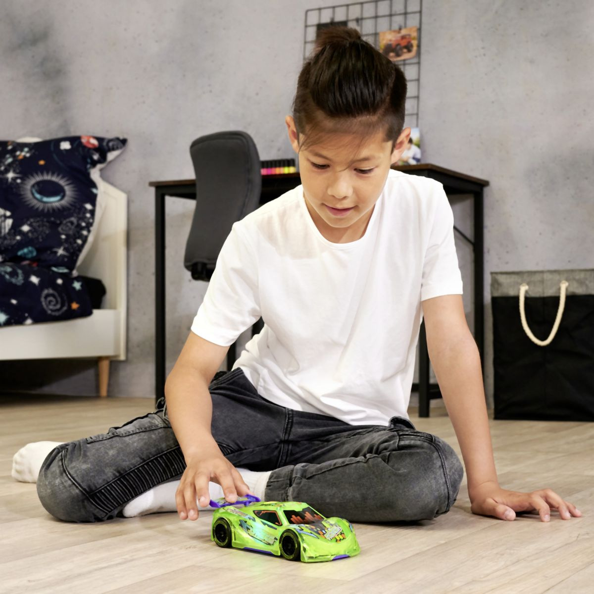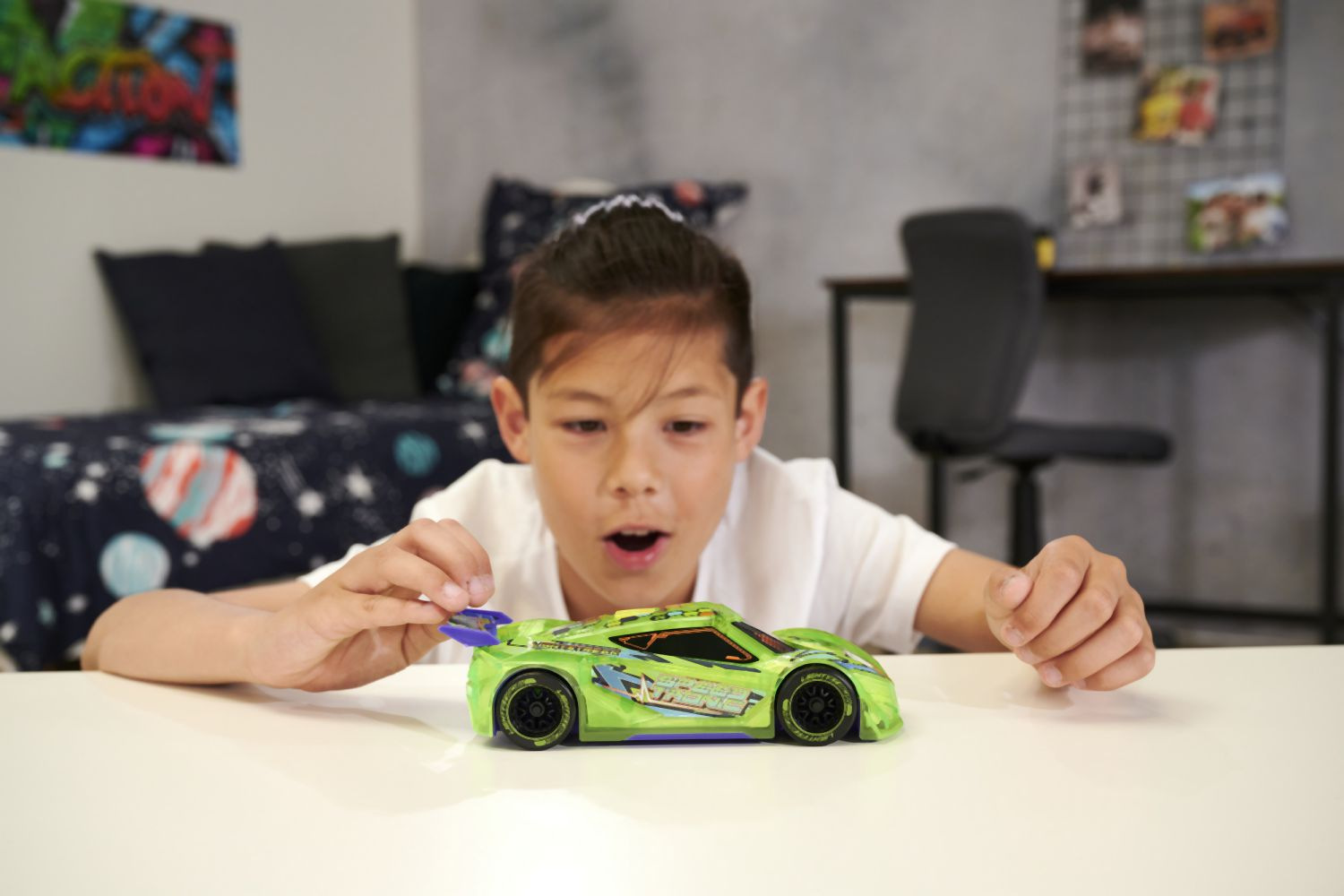 Závodní auto na setrvačník, mění barvy, zvuková funkce. Délka 20 cm.
