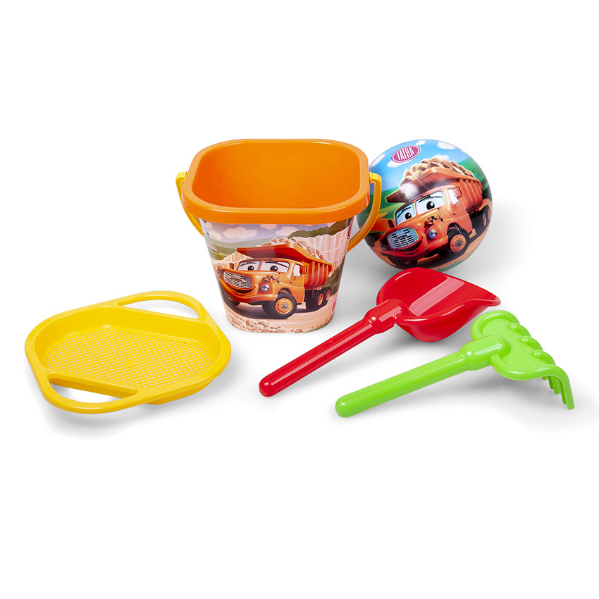 Pískový set obsahuje kyblík se sítkem, lopatku, hrabičky a míč 15 cm s ilustracemi Tatry.