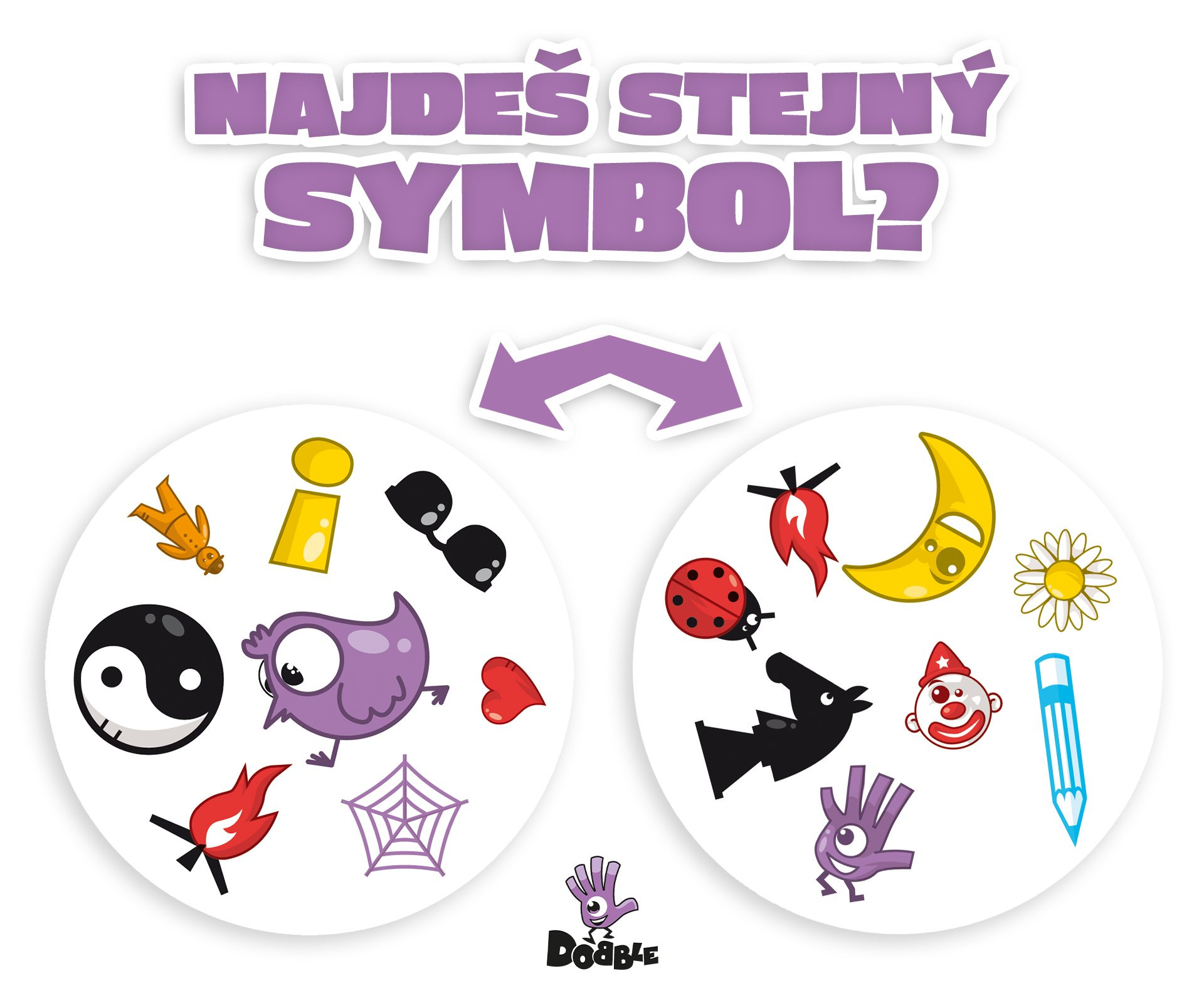 Dobble, to je 55 karet, 8 symbolů na kartě a každé dvě karty spolu mají společný pouze jeden!