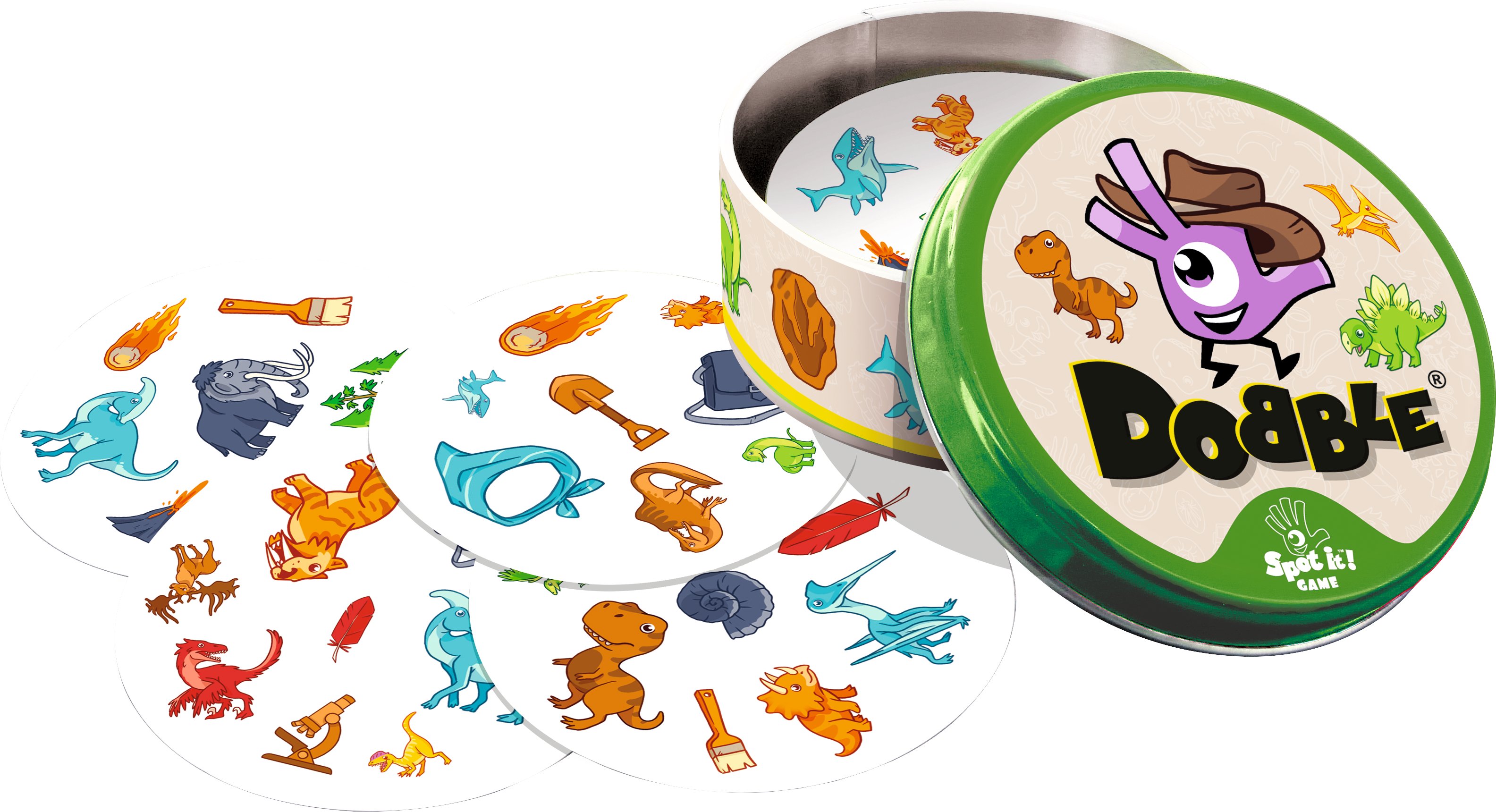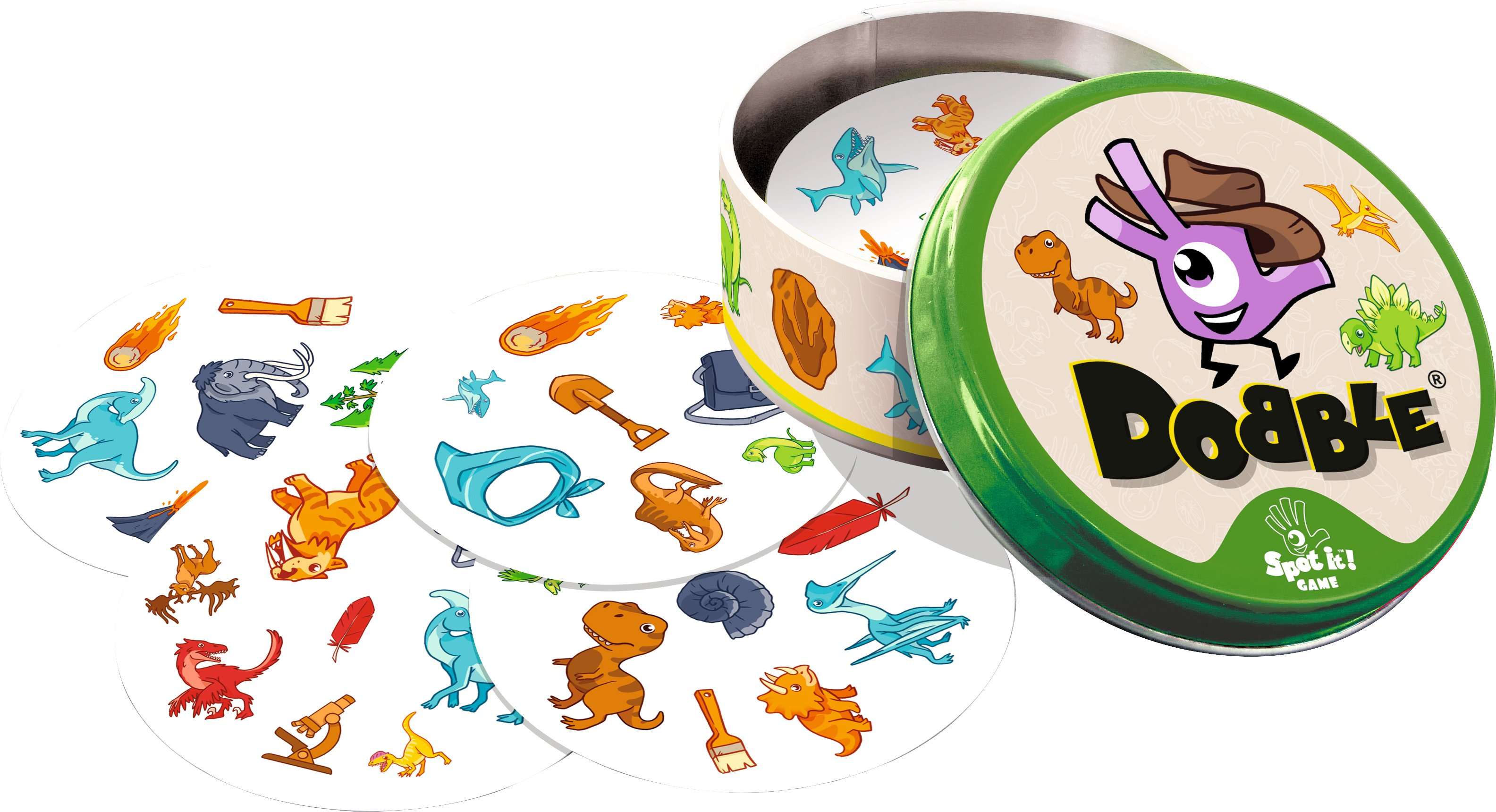 Rychlost, postřeh, reflexy! Dobble Dino, to je 57 různých symbolů, 55 karet, 8 obrázků na kartě a každé dvě karty spolu mají společný jen jeden obrázek!