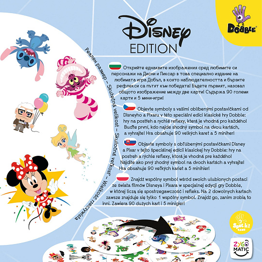 Objevte symboly s vašimi oblíbenými postavičkami od Disneyho a Pixaru v této speciální edici klasické hry Dobble: hry na postřeh a rychlé reflexy, která je vhodná pro každého! Buďte první, kdo najde shodný symbol na dvou kartách, a vyhrajte! Hra obsahuje 90 velkých karet (větších než u klasické hry Dobble) a 5 miniher!