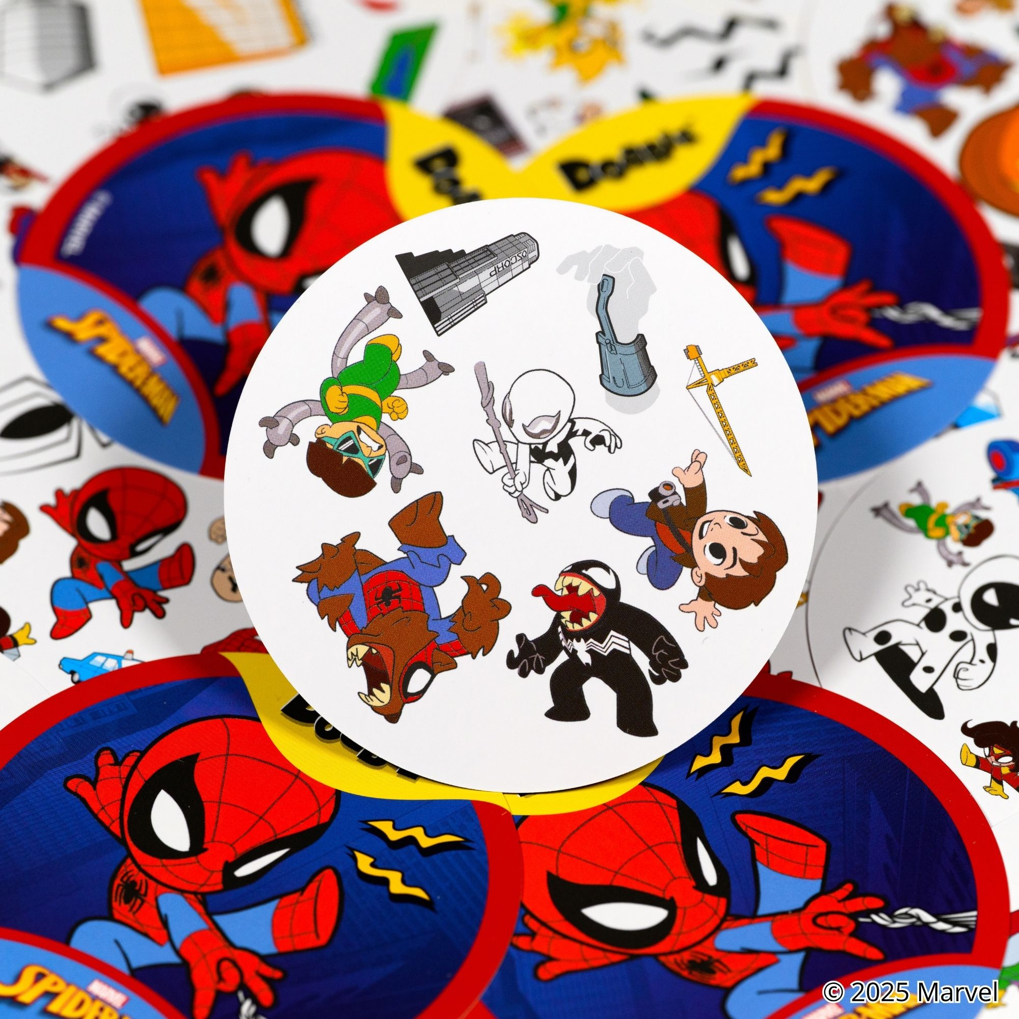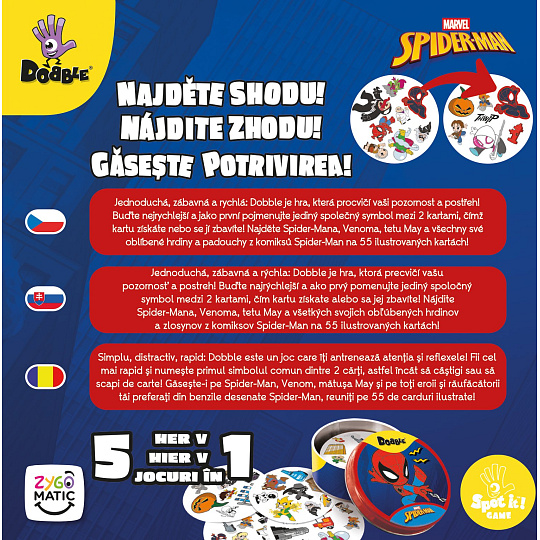 Jednoduchá, zábavná a rychlá: Dobble je hra, která procvičí vaši pozornost a postřeh! Buďte nejrychlejší a jako první pojmenujte jediný společný symbol mezi 2 kartami, čímž kartu získáte nebo se jí zbavíte! Najděte Spidermana, Venoma, tetu May a všechny své oblíbené hrdiny a padouchy z komiksů Spider-Man na 55 ilustrovaných kartách!