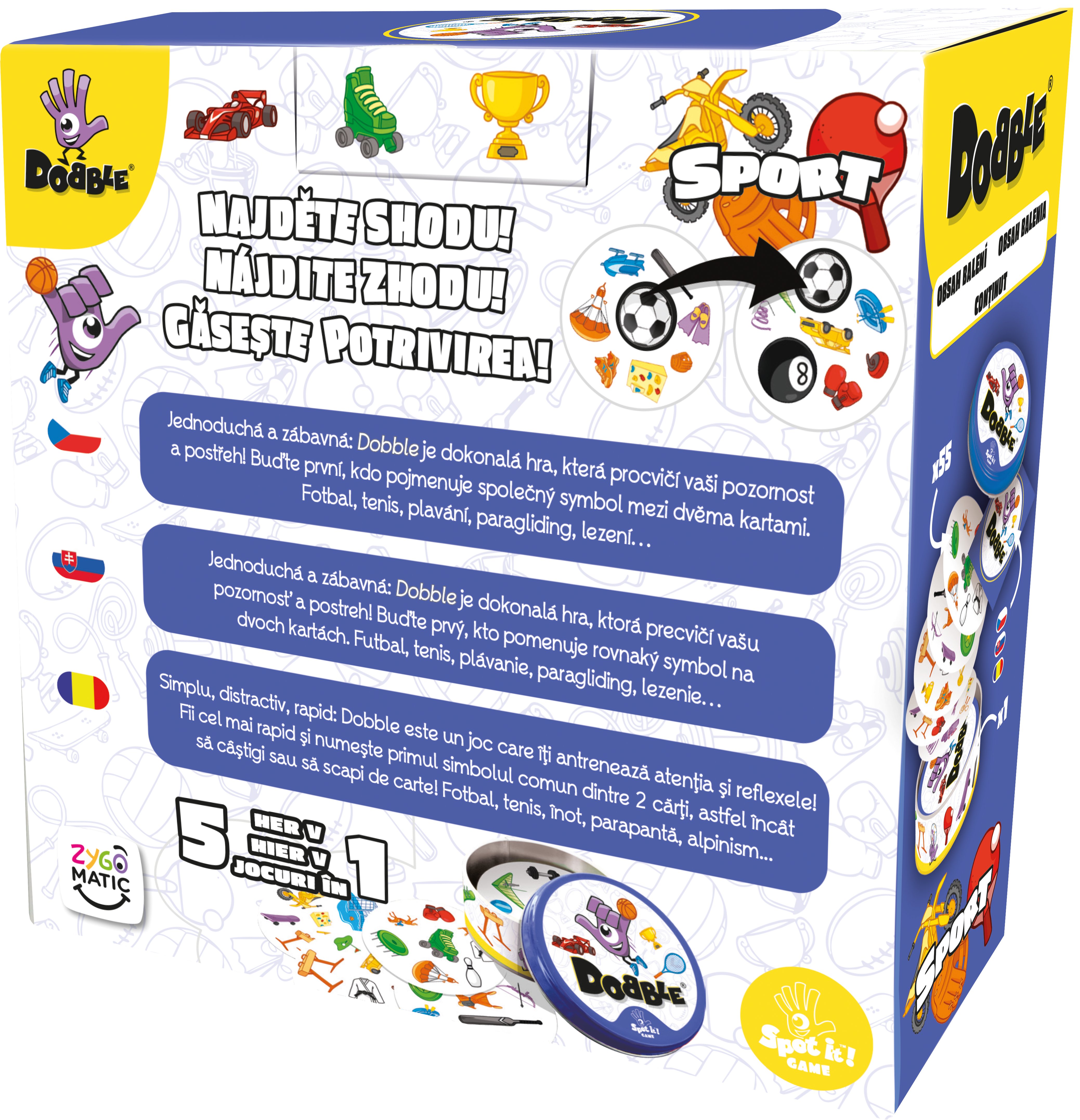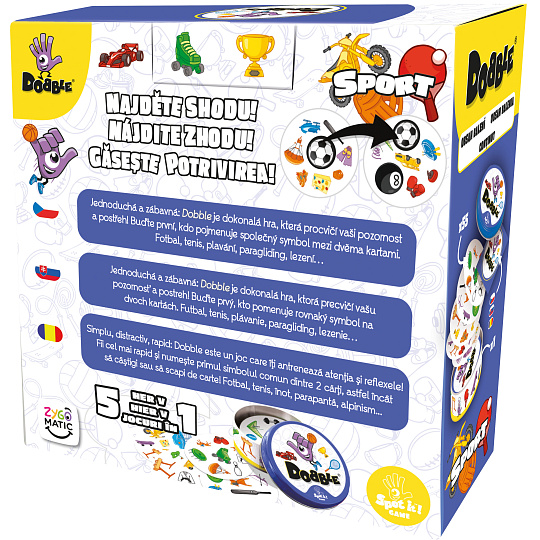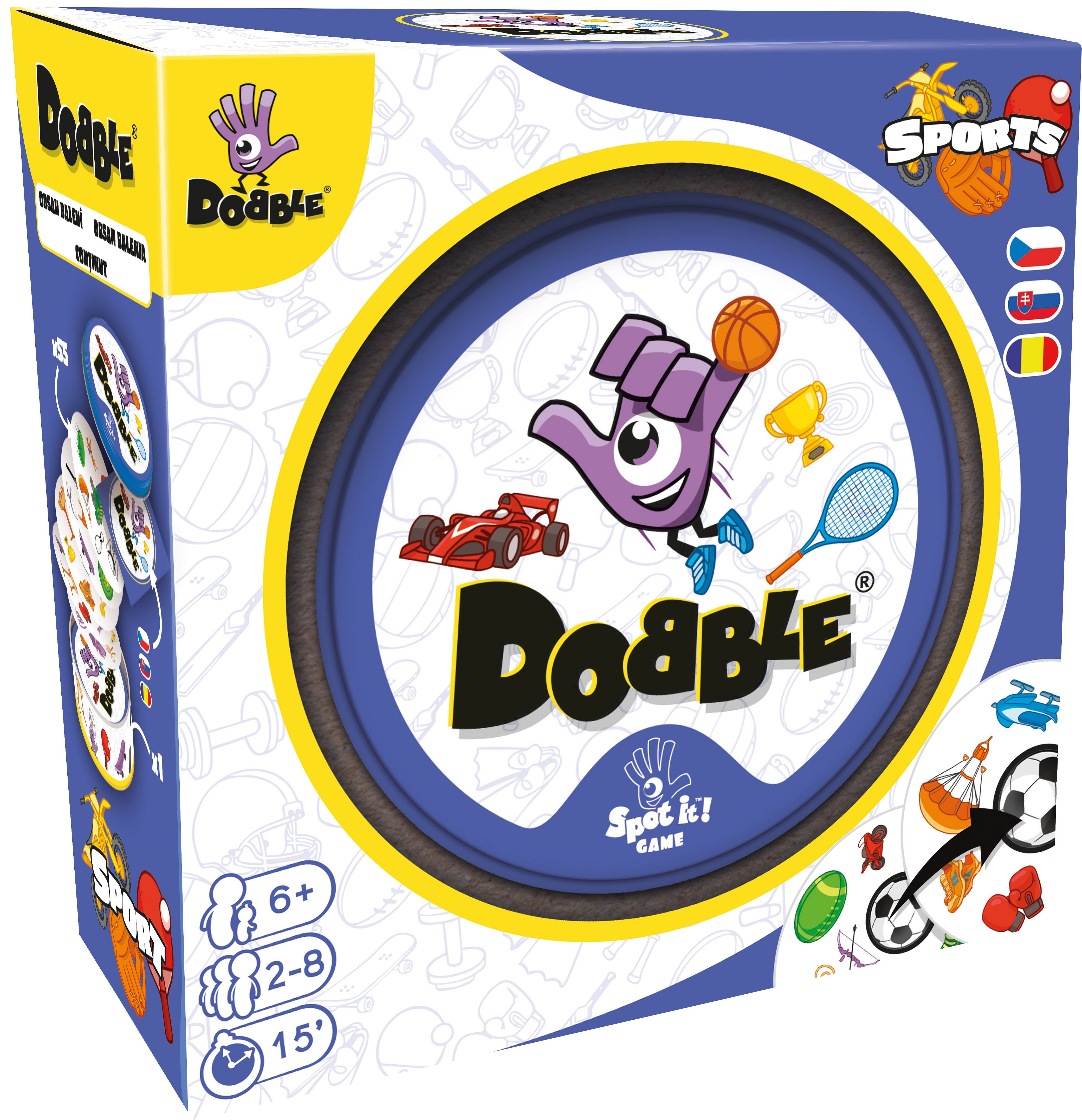 Postřehový bestseller Dobble vstupuje do světa sportu! Na každé kartě najdete 8 tematických obrázků. Máte rádi sport? Buďte první, kdo pojmenuje společný symbol mezi dvěma kartami. Fotbal, tenis, plavání, paragliding, lezení…