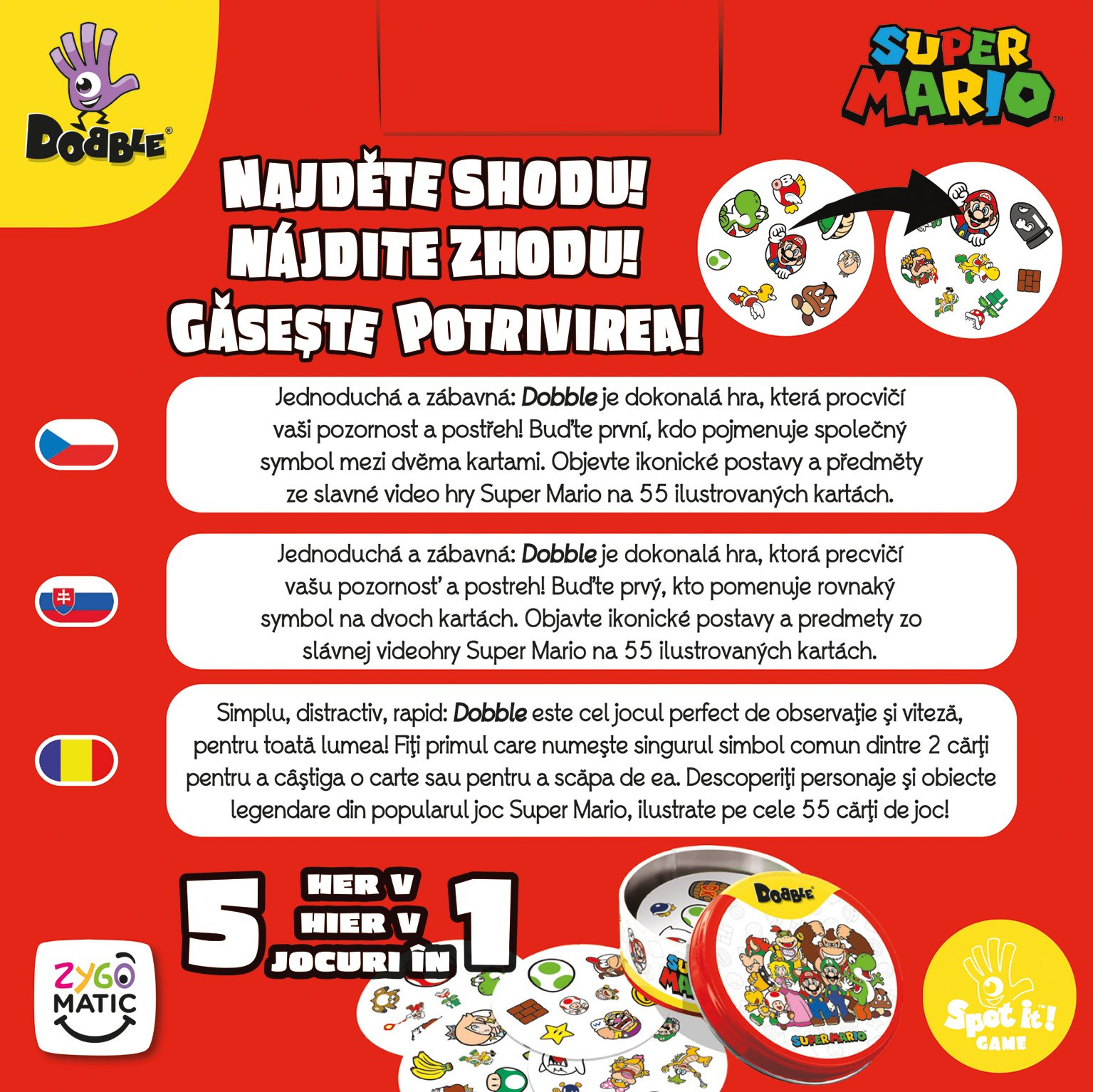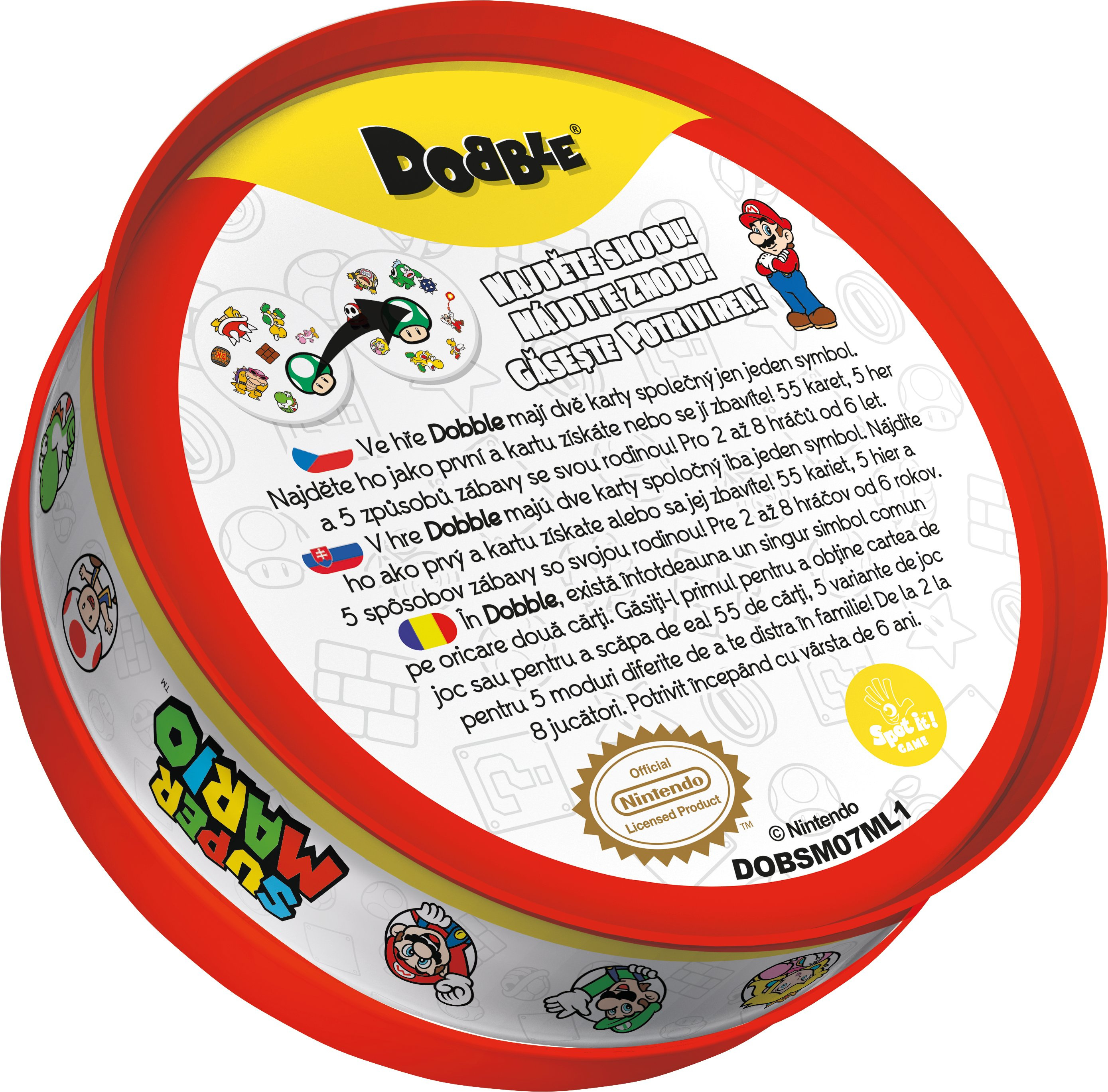 Postřehový bestseller se nyní vrací s oblíbenými postavičkami a ikonickými předměty ze Super Maria! Na každé kartě jich najdete 8 různých. Máte rádi Maria? Zahrajte si s ním a jeho přáteli i protivníky oblíbenou postřehovou hru Dobble! Hra je zaměřená na rychlost, postřeh a reflexy! Popis všech symbolů použitých ve hře najdete v pravidlech.