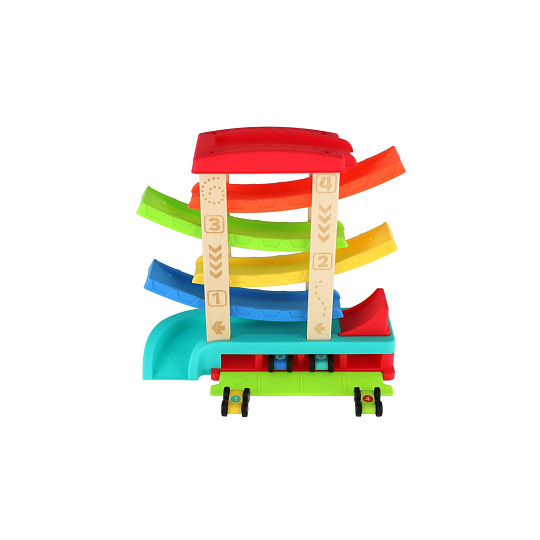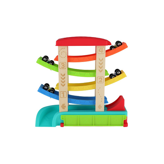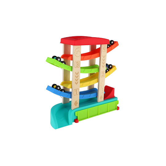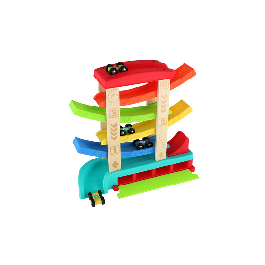 Barevná kaskádová závodní dráha z kvalitního dřeva zaručí dětem spoustu zábavy. Stačí umístit autíčko na horní plošinu a sledovat, jak sviští dolů po barevných rampách až do cíle. Sada obsahuje čtyři závodní autíčka, která jsou ideální pro malé dětské ruce. Rozměry výrobku 33 x 32 x 10 cm. Vhodné pro děti od 18 měsíců.