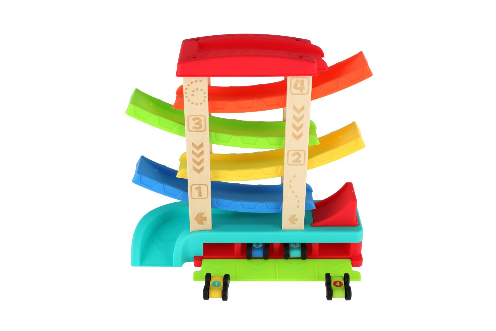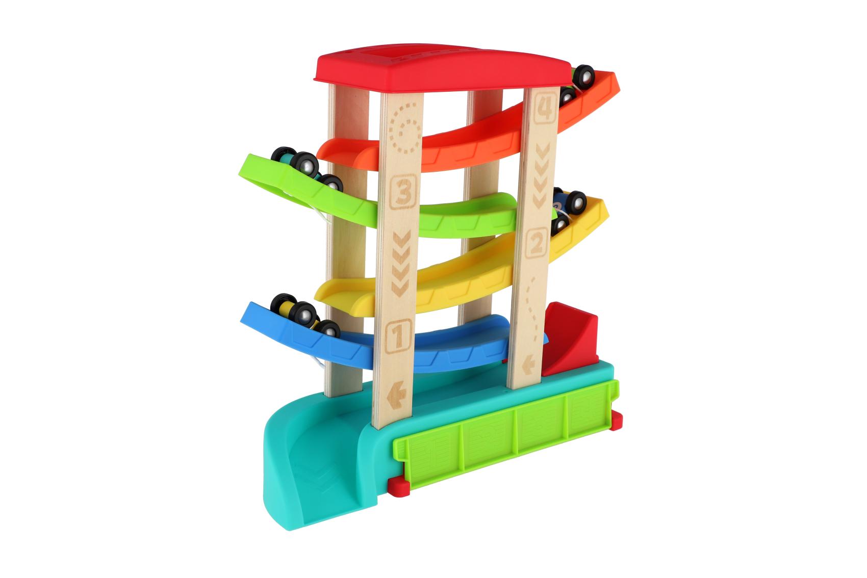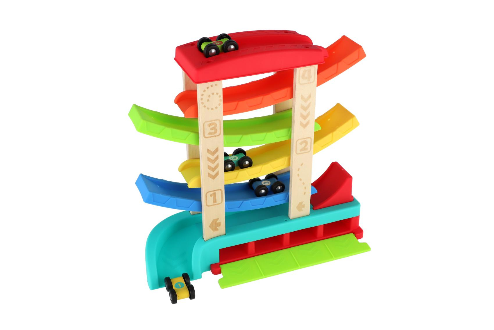 Barevná kaskádová závodní dráha z kvalitního dřeva zaručí dětem spoustu zábavy. Stačí umístit autíčko na horní plošinu a sledovat, jak sviští dolů po barevných rampách až do cíle. Sada obsahuje čtyři závodní autíčka, která jsou ideální pro malé dětské ruce. Rozměry výrobku 33 x 32 x 10 cm. Vhodné pro děti od 18 měsíců.