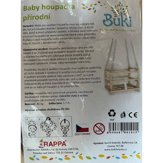 Houpačka z přírodního dřeva, se zábranou proti vypadnutí. Určená pro malé děti. Nosnost 80kg.