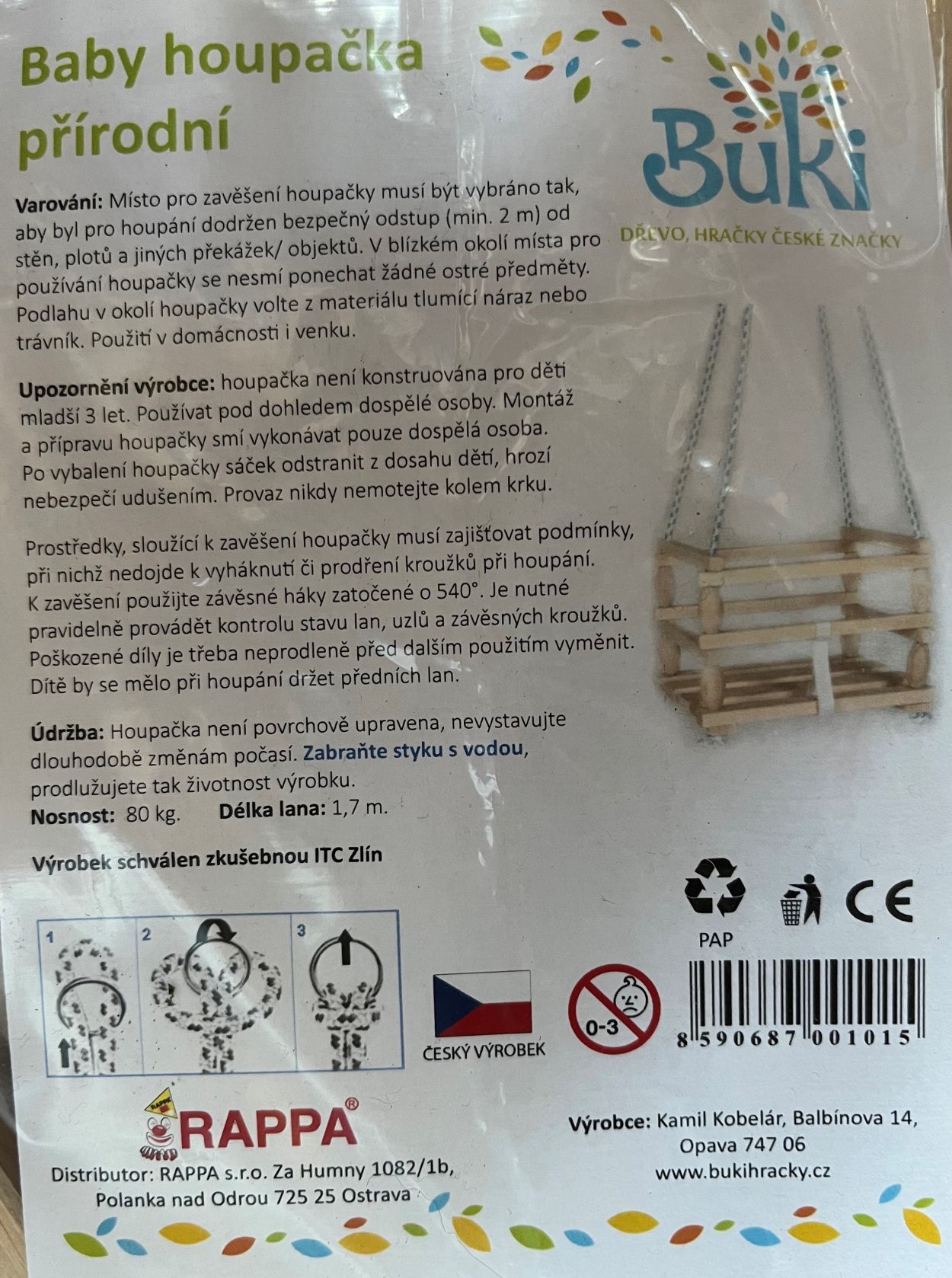 Houpačka z přírodního dřeva, se zábranou proti vypadnutí. Určená pro malé děti. Nosnost 80kg.