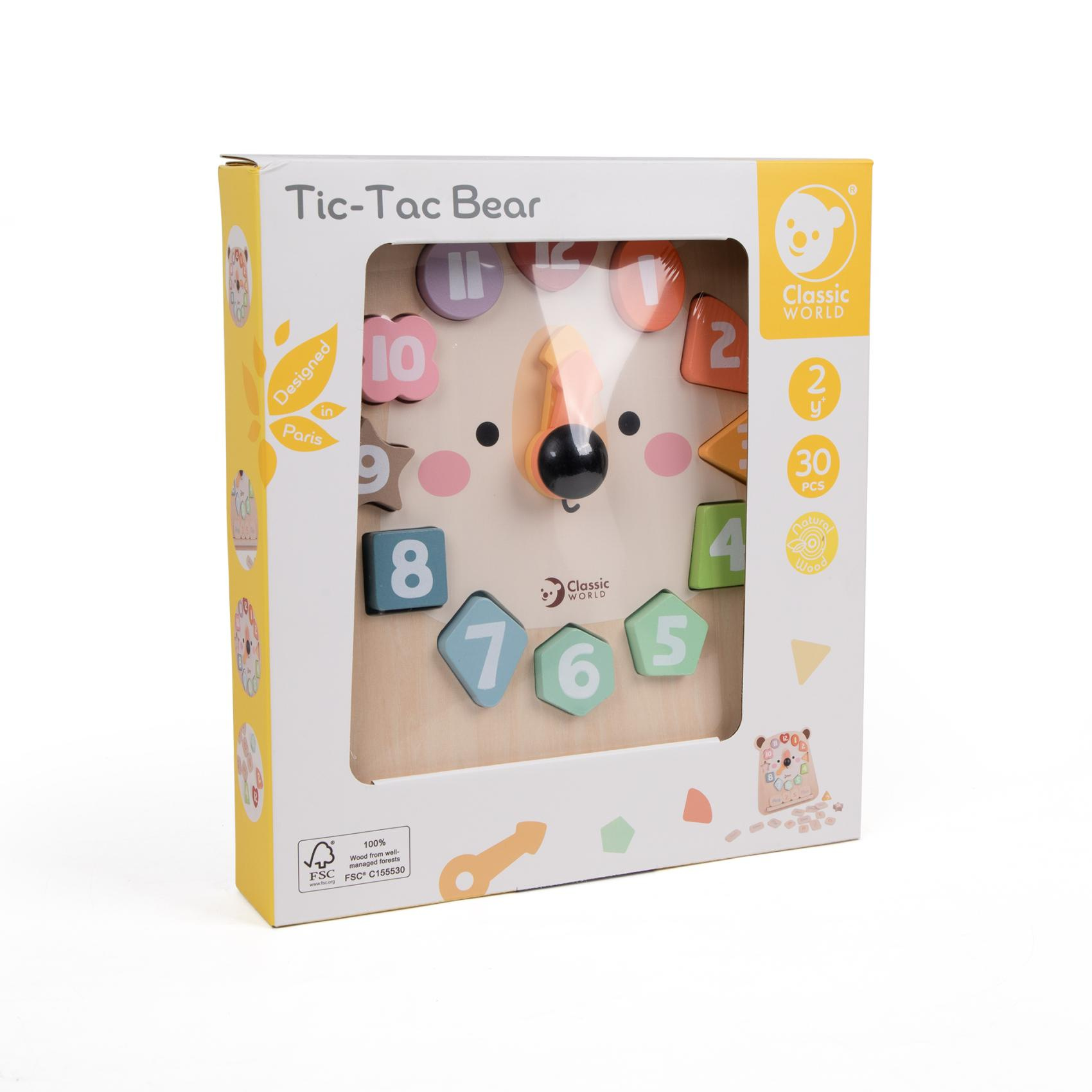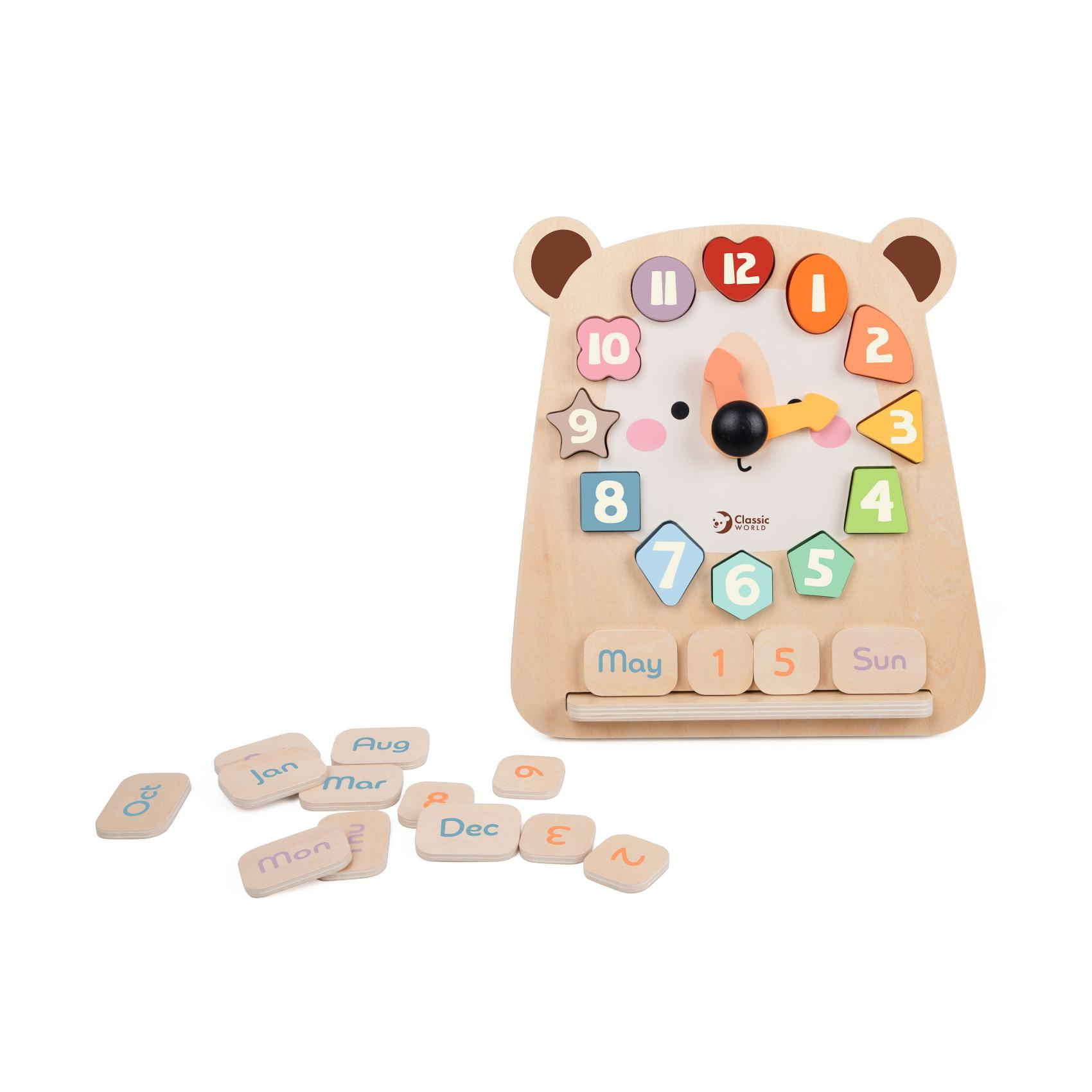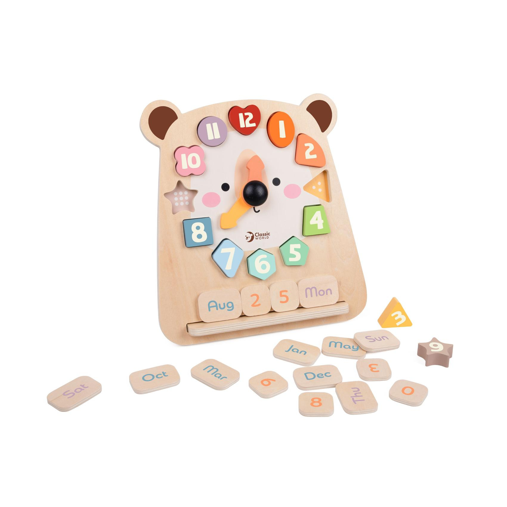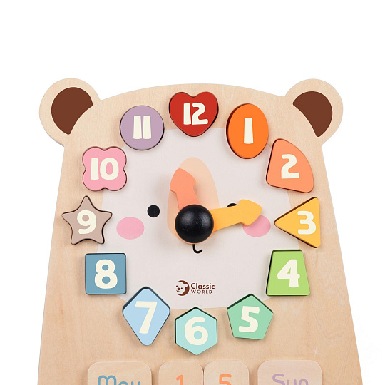 Roztomilé dřevěné hodiny s motivem medvěda pomáhají dětem zábavnou formou naučit se poznávat čas. Barevná vkládačka s čísly rozvíjí jemnou motoriku, logické myšlení i koordinaci ruky a oka. Otáčivé ručičky umožňují jednoduché procvičování hodin, zatímco jednotlivé dílky s čísly lze používat i samostatně při hře nebo počítání. Hračka je vyrobena z kvalitního dřeva a má veselý design, který zaujme každé dítě. Rozměry balení: 26 cm x 29 x 5cm Vhodné pro děti od 24 měsíců.