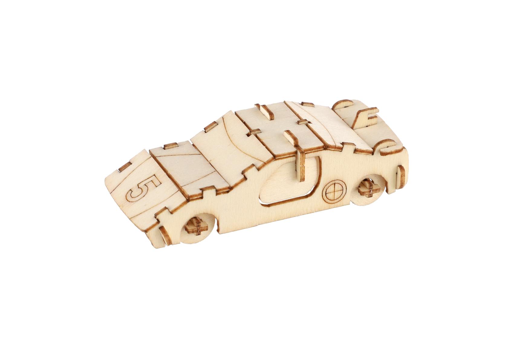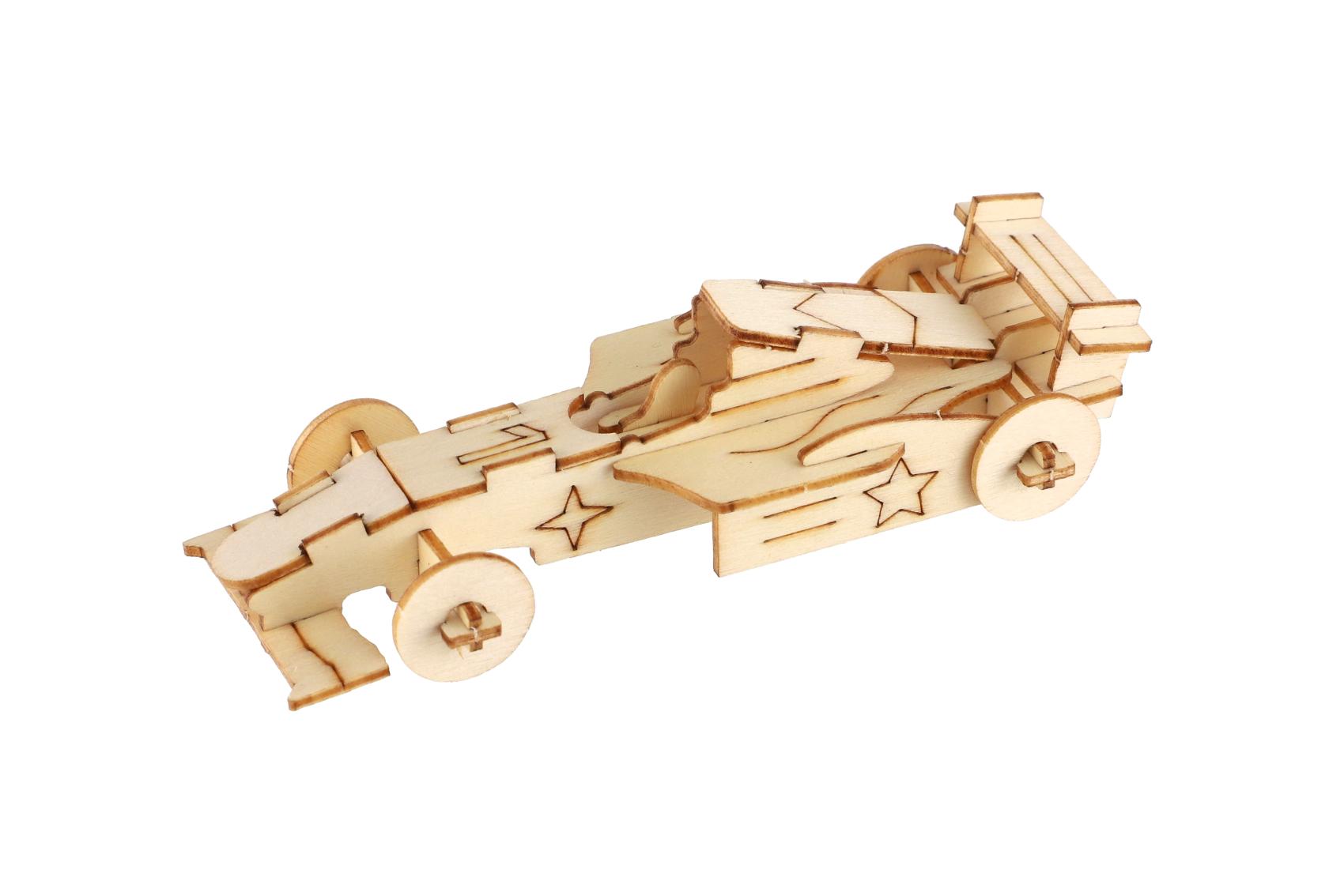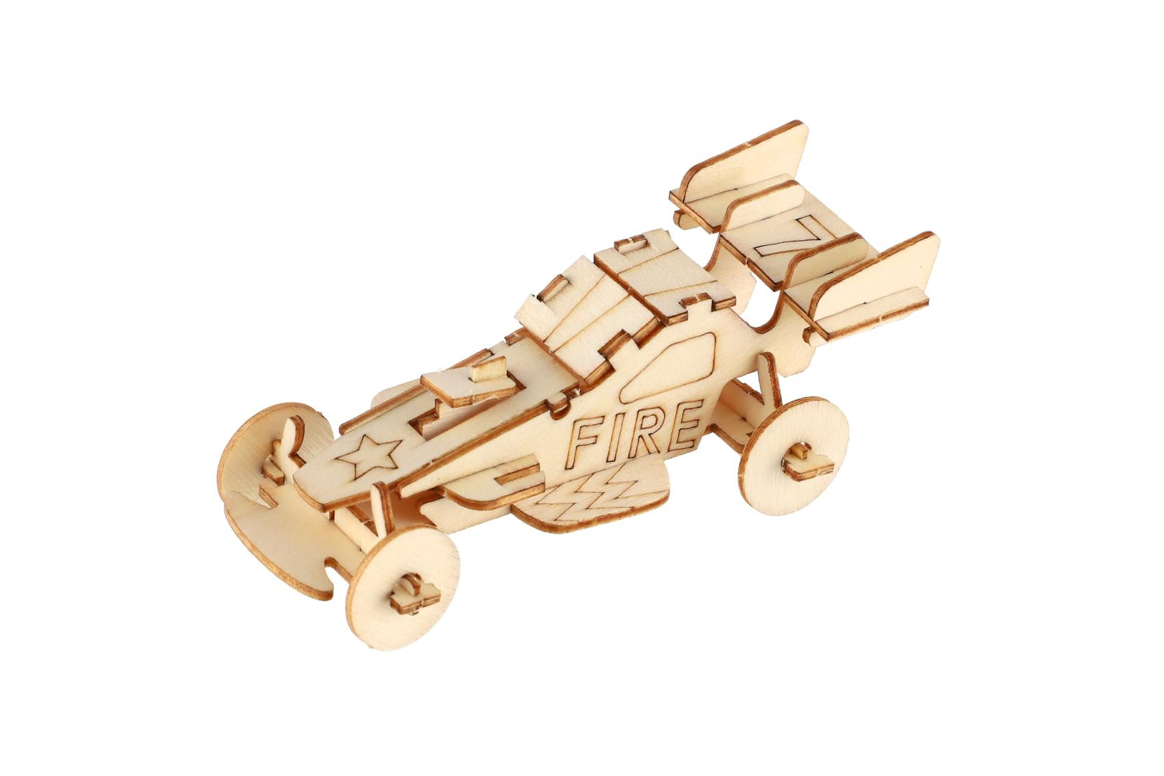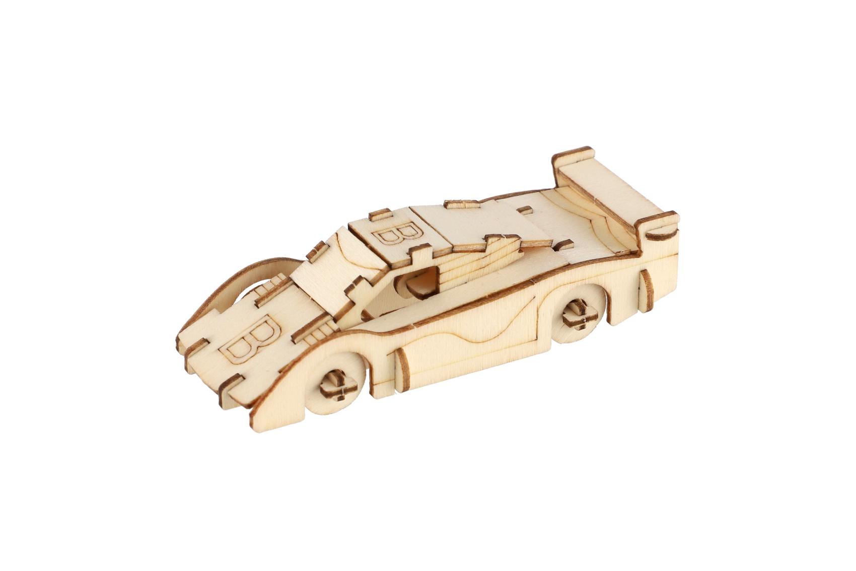 Kreativní dřevěná stavebnice v podobě závodních aut nadchne všechny malé konstruktéry i milovníky rychlých kol. Jednotlivé dílky se jednoduše vylamují z dřevěné překližky a skládají bez použití lepidla. Výsledkem je detailně propracovaný model auta, který poslouží jako hračka i stylová dekorace. Každé balení obsahuje 4 ks stavebnice. Stavebnice podporuje rozvoj jemné motoriky, trpělivosti, logického myšlení a prostorové představivosti.