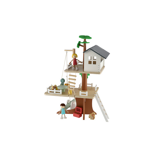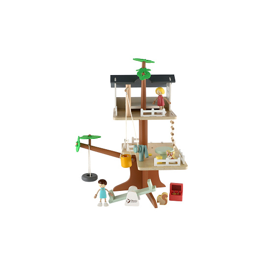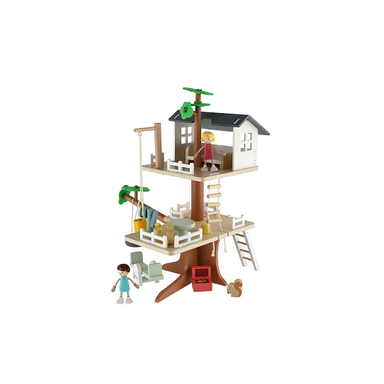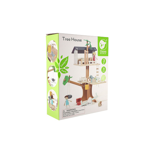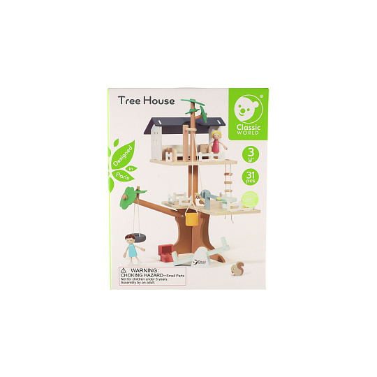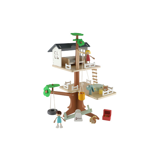 Děti si mohou postavit dům na stromě se mnoha doplňky. Balení obsahuje 2 figurky (chlapečka a holčičku), figurku psa, veverku houpačky, kladku, vědro, truhlu s pokladem, postel, stůl a židle. Pomocí klady mohou děti vyzvednout vědro až do koruny stromů. Balení obsahuje 31 dřevěných dílků. Rozměr krabice: 29 x 36 x 11 cm Vhodné pro děti od 3 let