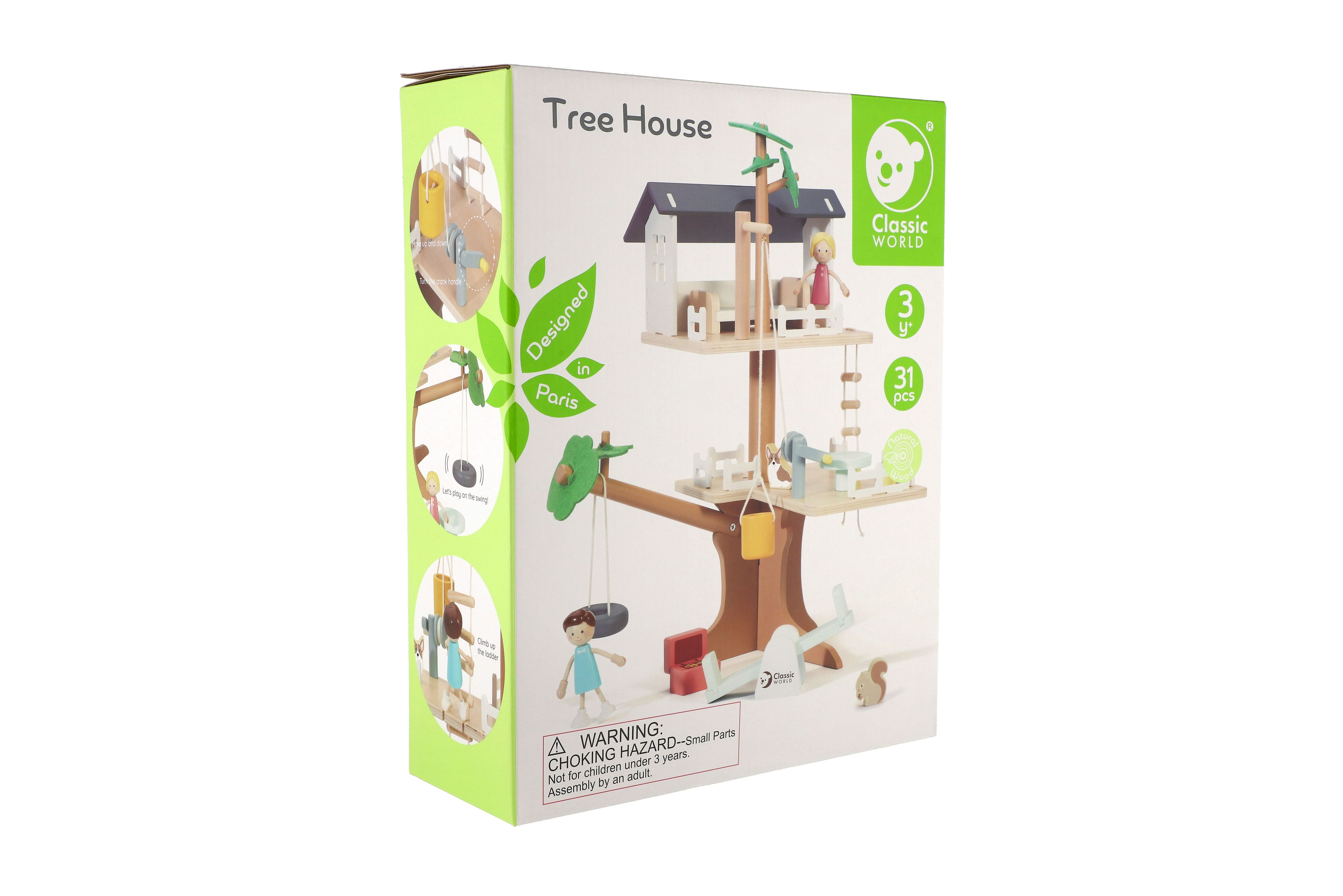 Děti si mohou postavit dům na stromě se mnoha doplňky. Balení obsahuje 2 figurky (chlapečka a holčičku), figurku psa, veverku houpačky, kladku, vědro, truhlu s pokladem, postel, stůl a židle. Pomocí klady mohou děti vyzvednout vědro až do koruny stromů. Balení obsahuje 31 dřevěných dílků. Rozměr krabice: 29 x 36 x 11 cm Vhodné pro děti od 3 let