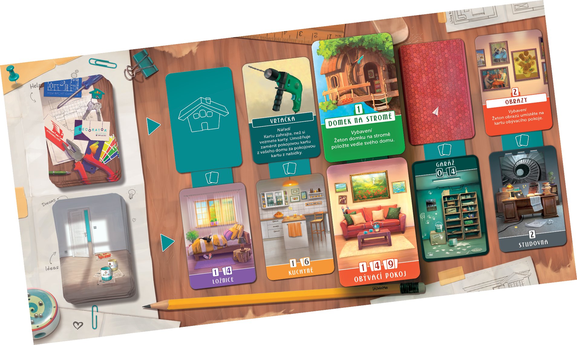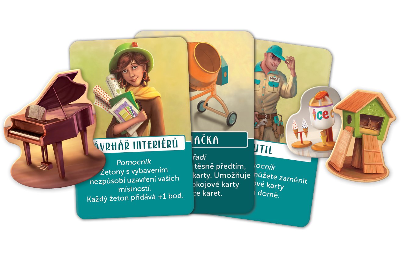 Obsah balení: 1 herní deska, 4 herní desky hráčů, 60 pokojových karet, 28 střešních karet, 20 karet s nástroji, vybavením a pomocníky, 10 žetonů vybavení, 1 miniatura domu pro prvního hráče, 1 knížka s hodnocením, česká a slovenská pravidla