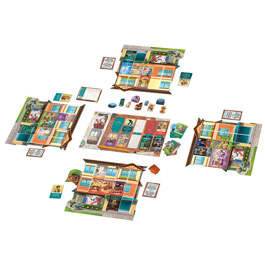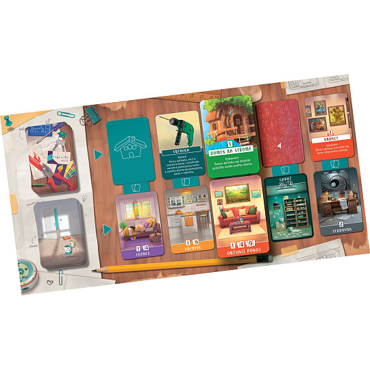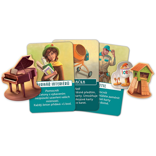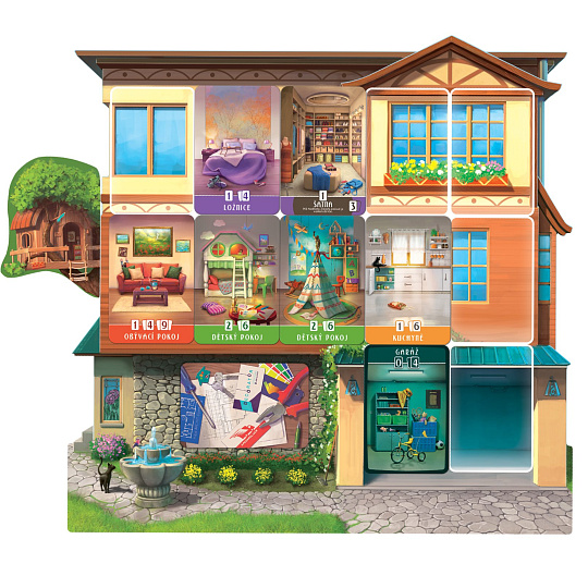 Obsah balení: 1 herní deska, 4 herní desky hráčů, 60 pokojových karet, 28 střešních karet, 20 karet s nástroji, vybavením a pomocníky, 10 žetonů vybavení, 1 miniatura domu pro prvního hráče, 1 knížka s hodnocením, česká a slovenská pravidla
