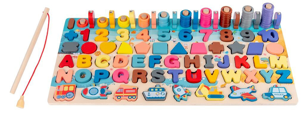 Každý malý šikula si najde to své! Dřevěná multifunkční deska nabízí edukativní hru a pomáhá dětem v koordinaci motoriky, zlepšování koncentrace a rozvoji logického myšlení. Jejím cílem je nejen učení přeměnit na zábavu, ale také vyvinout k učení u nejmenších kladný vztah. Vedle rozpoznávání čísel, tvarů a barev lze v této hře "rybařit" či stohovat kroužky na sebe. Všechny části dřevěné skládačky jsou dimenzovány tak, aby byly ideální pro drobné dětské ruce. Hlavní vlastnosti: multifunkční edukativní hra, ideální pro trénování motoriky a posílení logického myšlení, podporuje kreativitu, mění učení na zábavu, veselý, pestrý design