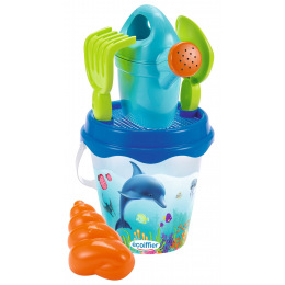 Set na písek s motivem delfína. Obsahuje kyblíček, sítko, hrabičky a lopatičku, konvičku a formičku. Průměr kyblíčku 17 cm, výška kyblíčku 18 cm.