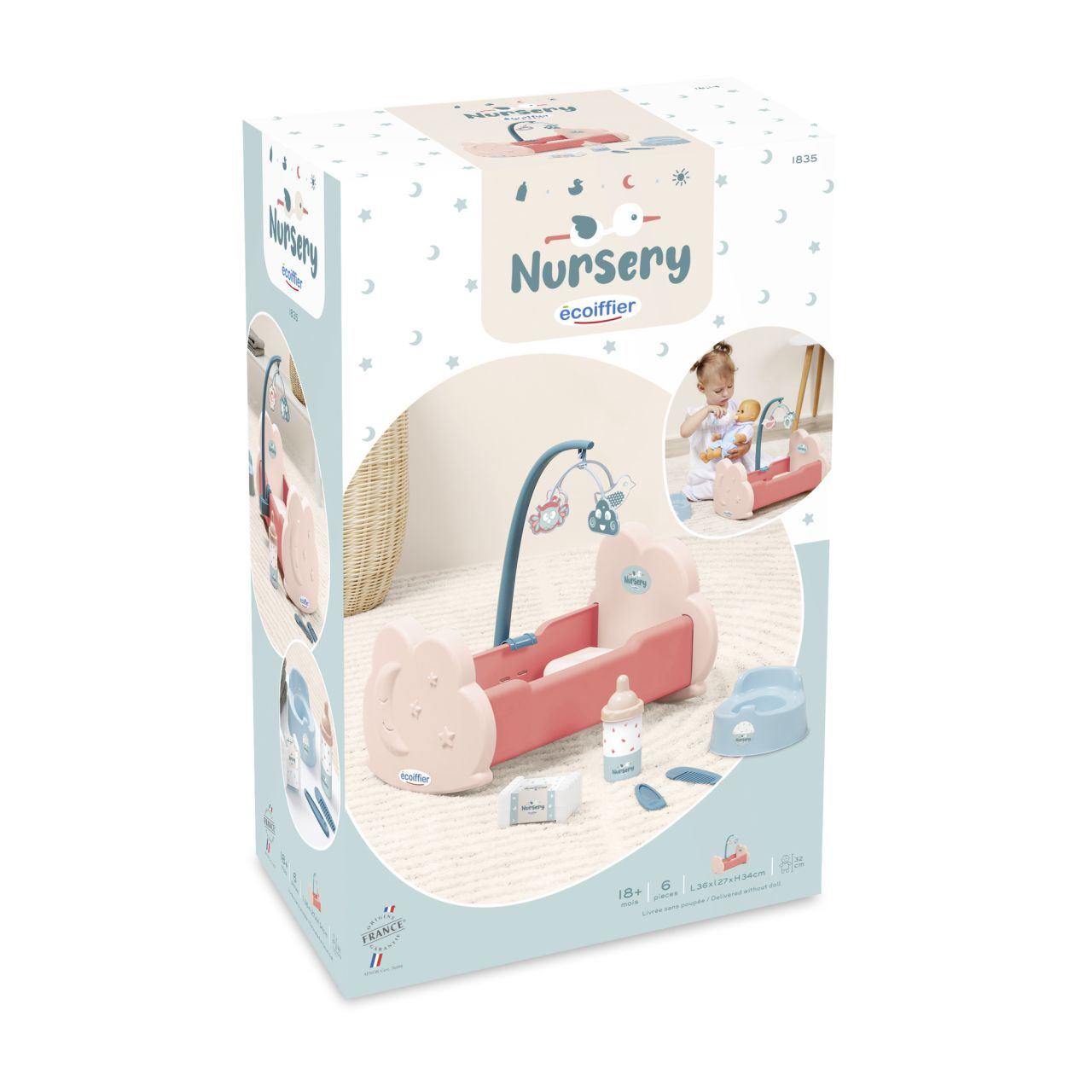 Postýlka pro panenku s příslušenstvím. Součástí je kolotoč nad postýlku, lahvička, nočník, hřeben atd. Rozměry postýlky (DxŠxV): 36 x 27 x 34 cm.