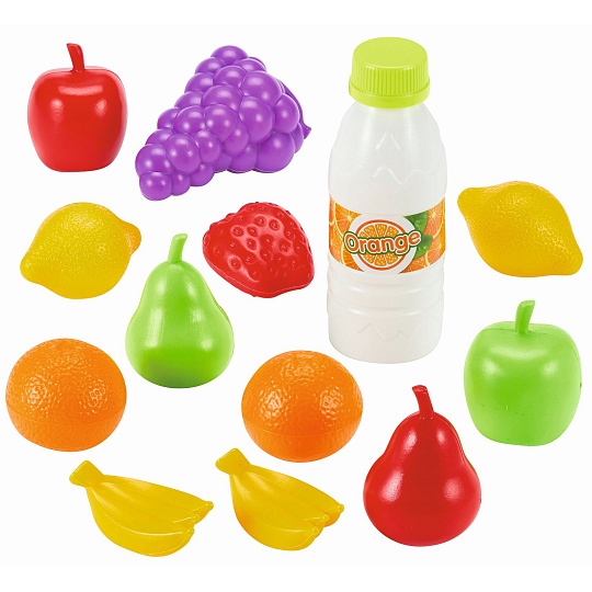 Makety potravin v síťce. Síťka obsahuje celkem 13 doplňků - 2 citrony, jahodu, 2 pomeranče, 2 jablka, 2 hrušky, 2 trsy banánů, hrozen vína a láhev pomerančového džusu. Ideální také jako vybavení obchodu nebo jako doplněk do dětské kuchyňky. Rozměry produktu (DxŠxV): 16 x 16 x 13 cm.