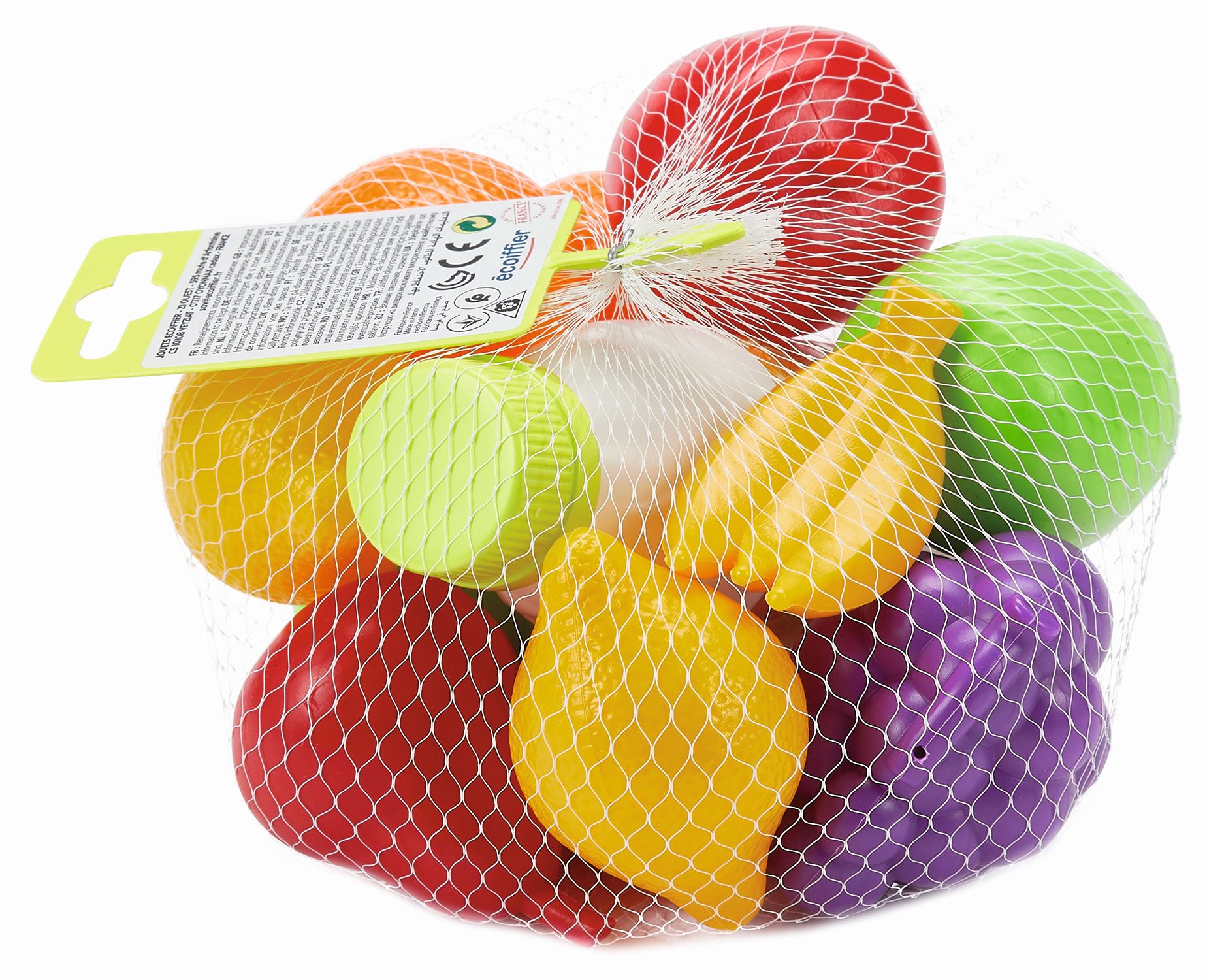 Makety potravin v síťce. Síťka obsahuje celkem 13 doplňků - 2 citrony, jahodu, 2 pomeranče, 2 jablka, 2 hrušky, 2 trsy banánů, hrozen vína a láhev pomerančového džusu. Ideální také jako vybavení obchodu nebo jako doplněk do dětské kuchyňky. Rozměry produktu (DxŠxV): 16 x 16 x 13 cm.