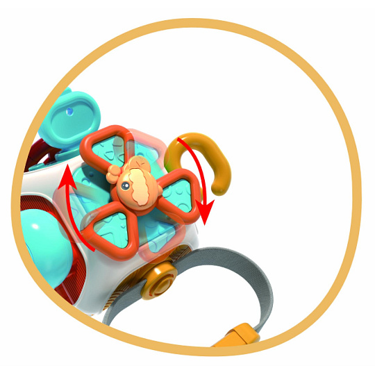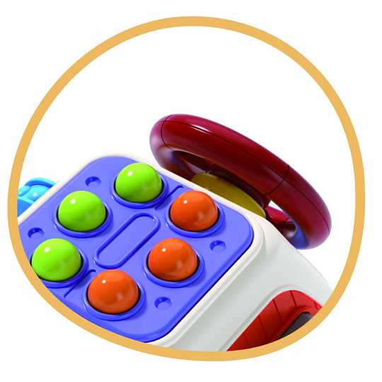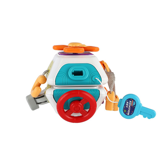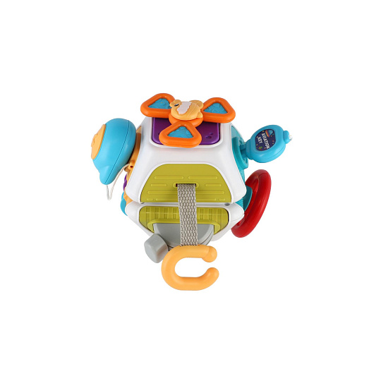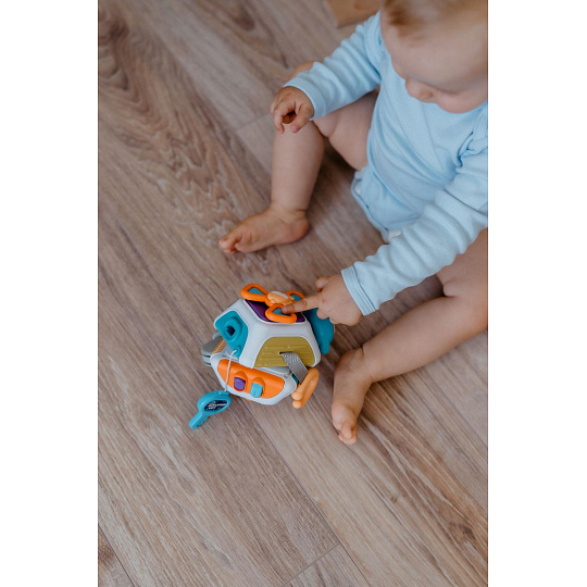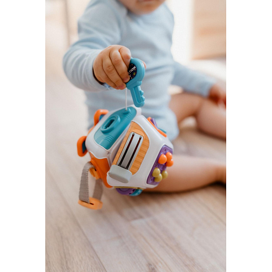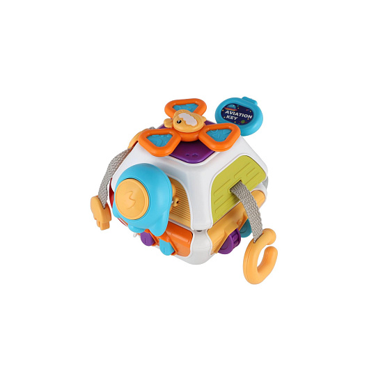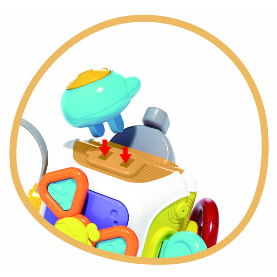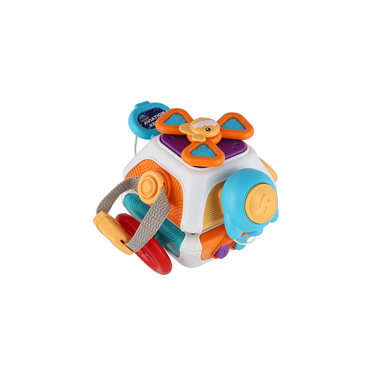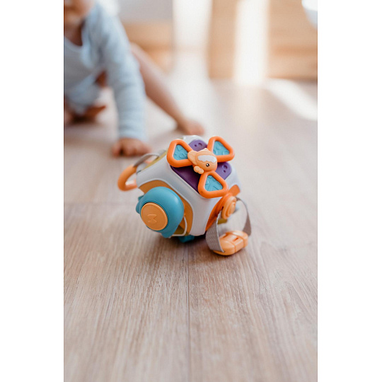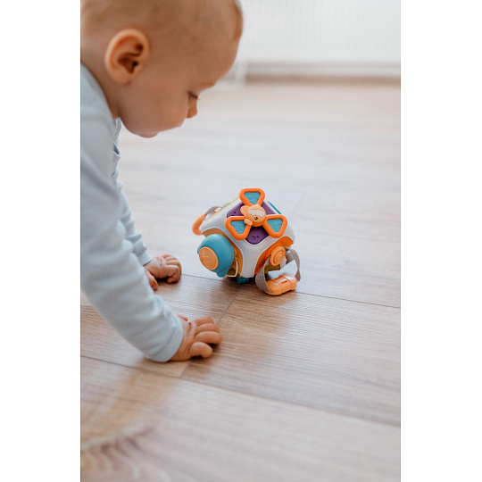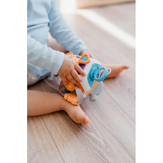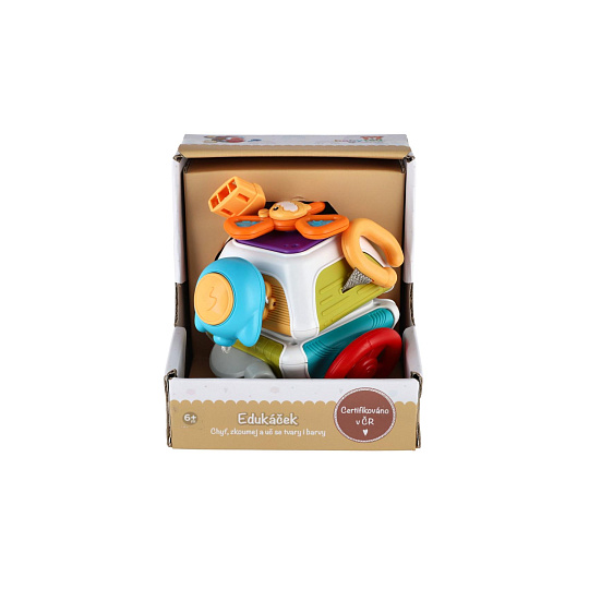 Barevná multifunkční kostka, která zabaví i podpoří správný rozvoj děťátka. Edukáček nabízí na každé straně jinou aktivitu – děti mohou mačkat, otáčet, posouvat i objevovat různé textury a tvary. Horní část zdobí vrtulka, kterou lze otáčet, a každá strana kostky přináší nové překvapení. Díky praktickým úchytům na hračce se dobře manipuluje malými dětskými ručičkami. Certifikováno v ČR.