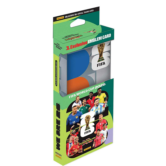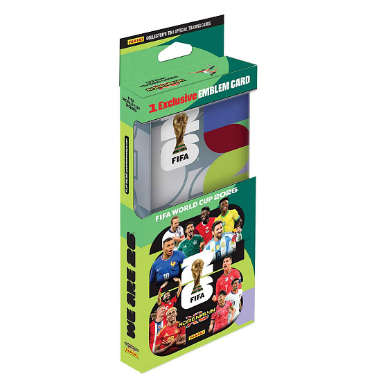 Sběratelské karty FIFA WORLD CUP 2026. Plechová krabička obsahuje: 4 balíčky karet (balíček obsahuje 8 karet), 2 Limitované karty a 1 kartu Exclusive EMBLEM.