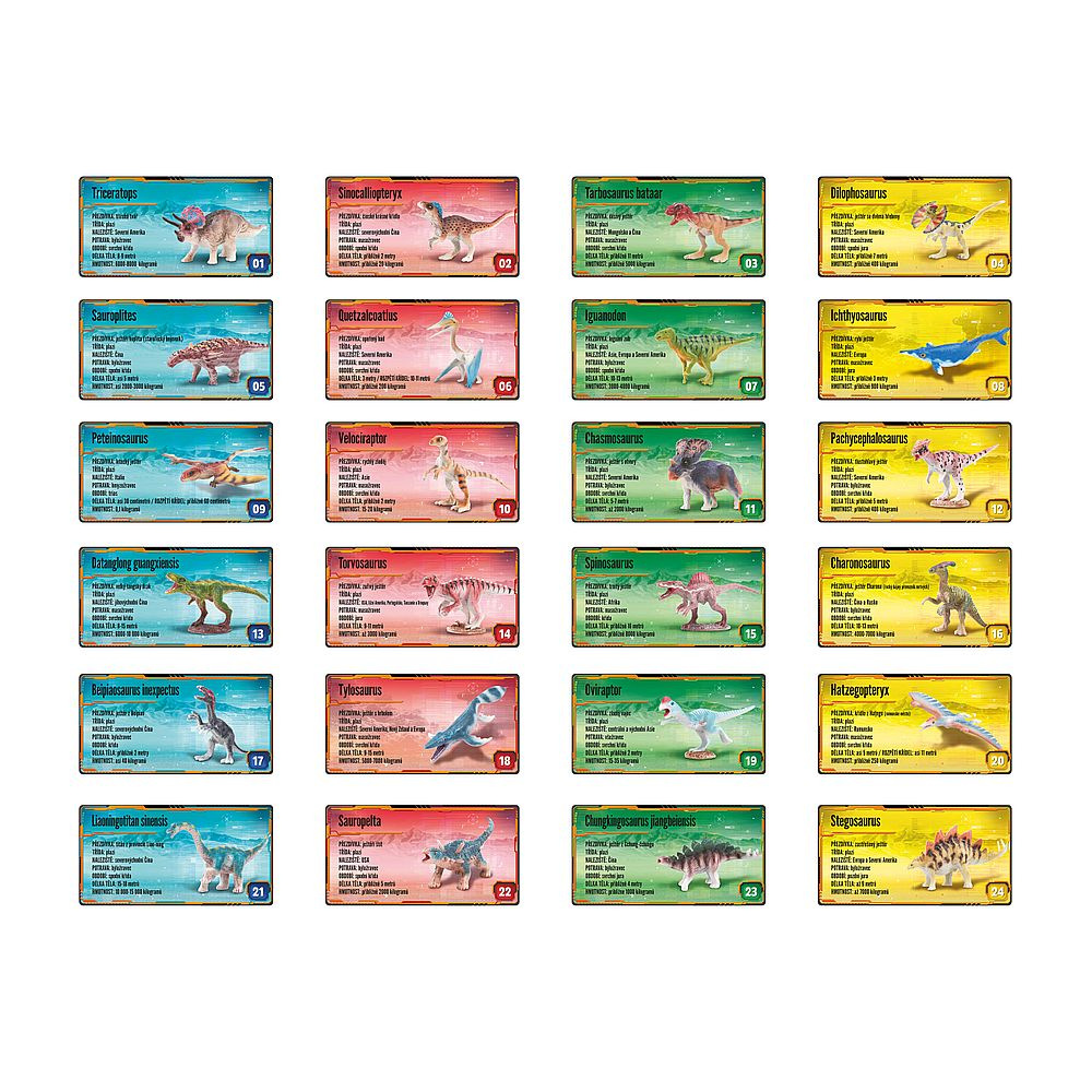 DINOTIME - To jsou figurky dinosaurů v jednotlivých balení s kartou postavy. Nasbírejte všech 24 druhů různých dinosaurů DINOTIME, dozvíte se o nich spoustu informací. Figurky mají kvalitní zpracování a pestré barvy. Vhodné pro děti od 3 let. Rozměry výrobku 8 x 15 x 2 cm.
