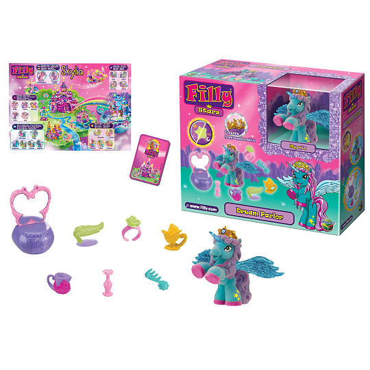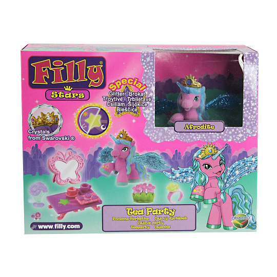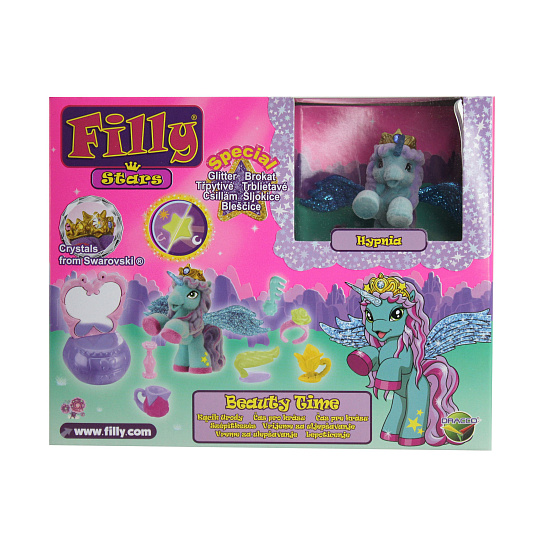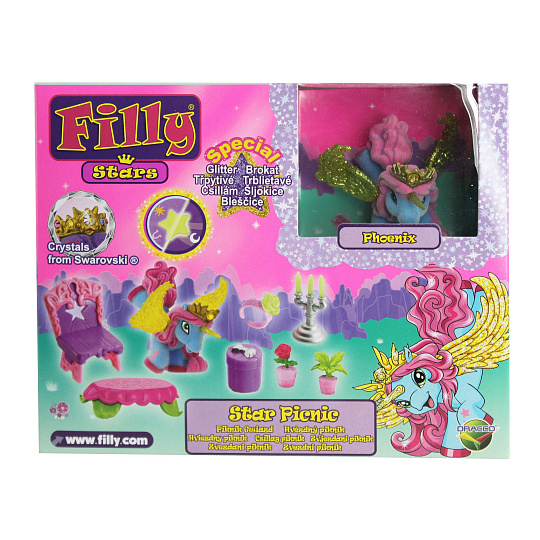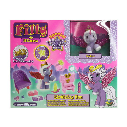 Z velmi vzdálené tajuplné země k vám přicválali noví Filly koníčci, koníčci Filly Stars. Mají kouzelné rohy a překrásná třpytivá křídla. Každý koník má zlatou korunku, kterou zdobí barevný křišťál. Rozměry balení 18 x 14 x 6 cm. Vhodné pro děti od 3 let.