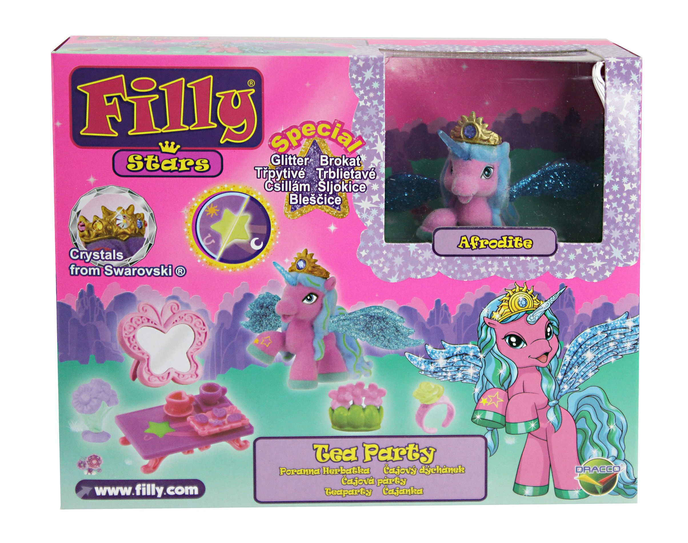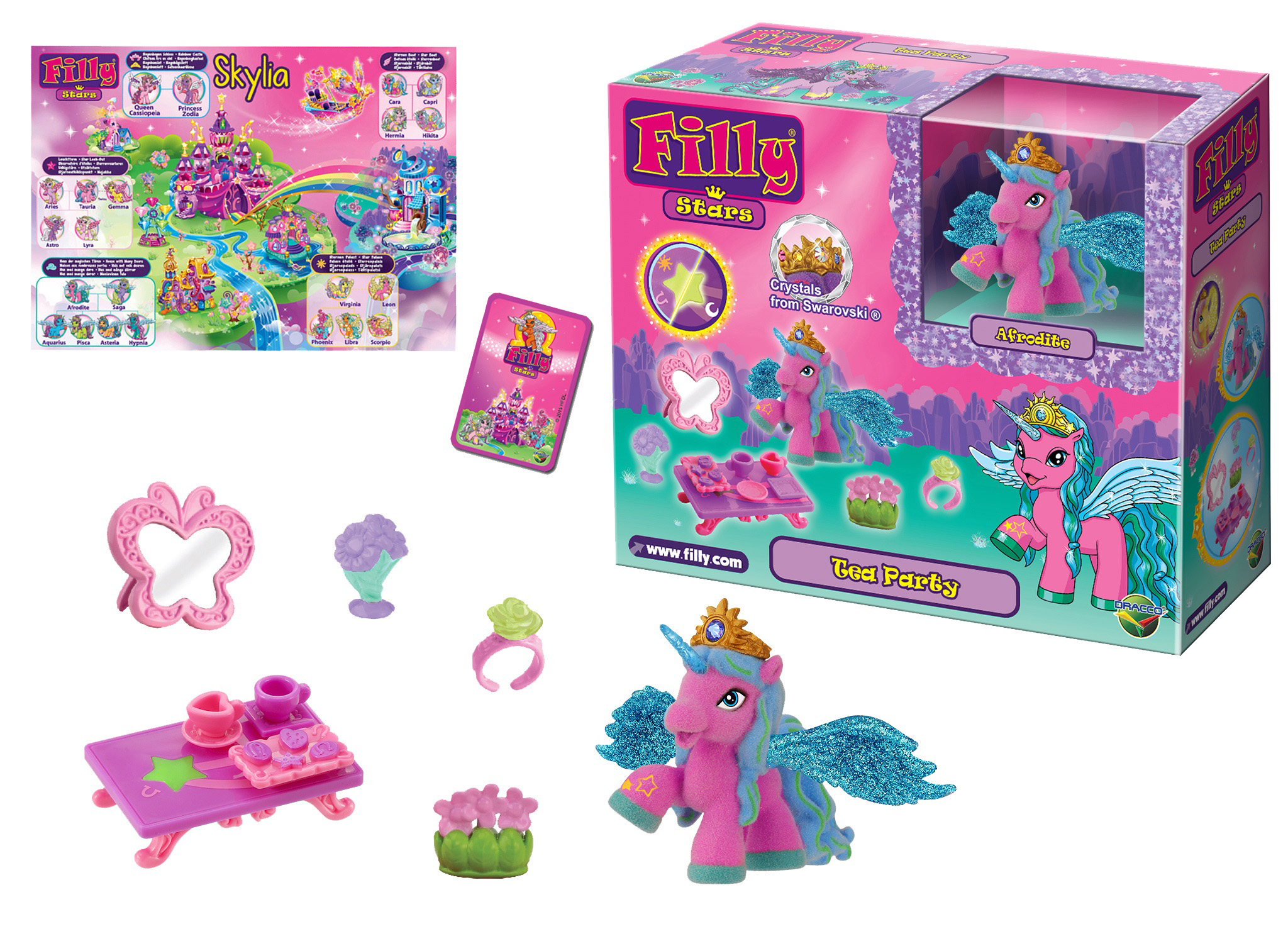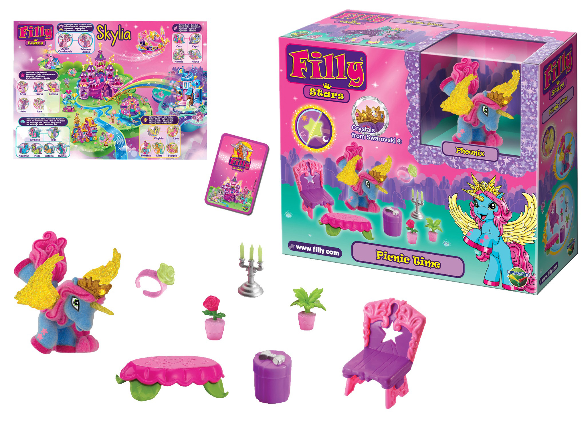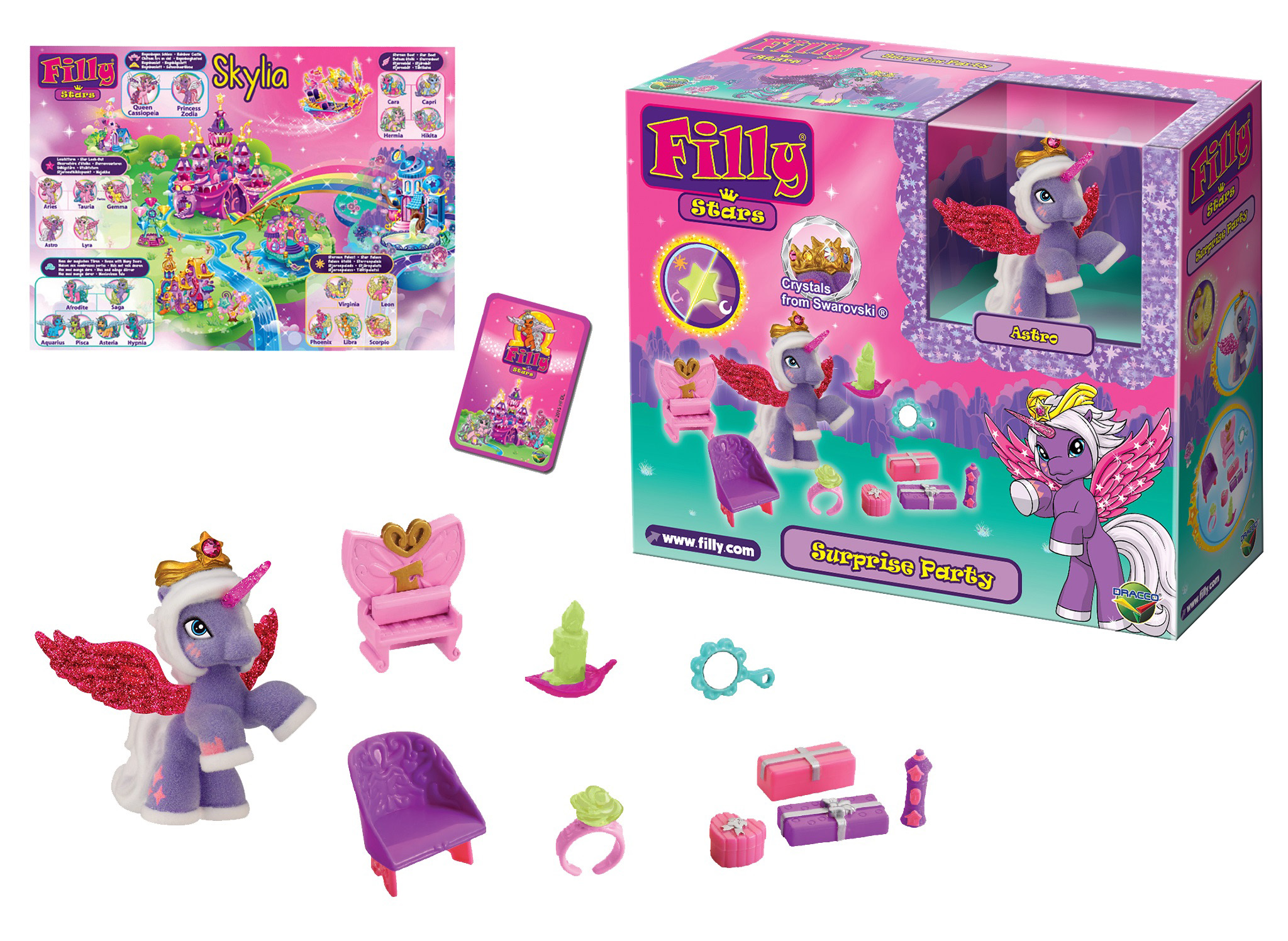 Z velmi vzdálené tajuplné země k vám přicválali noví Filly koníčci, koníčci Filly Stars. Mají kouzelné rohy a překrásná třpytivá křídla. Každý koník má zlatou korunku, kterou zdobí barevný křišťál. Rozměry balení 18 x 14 x 6 cm. Vhodné pro děti od 3 let.