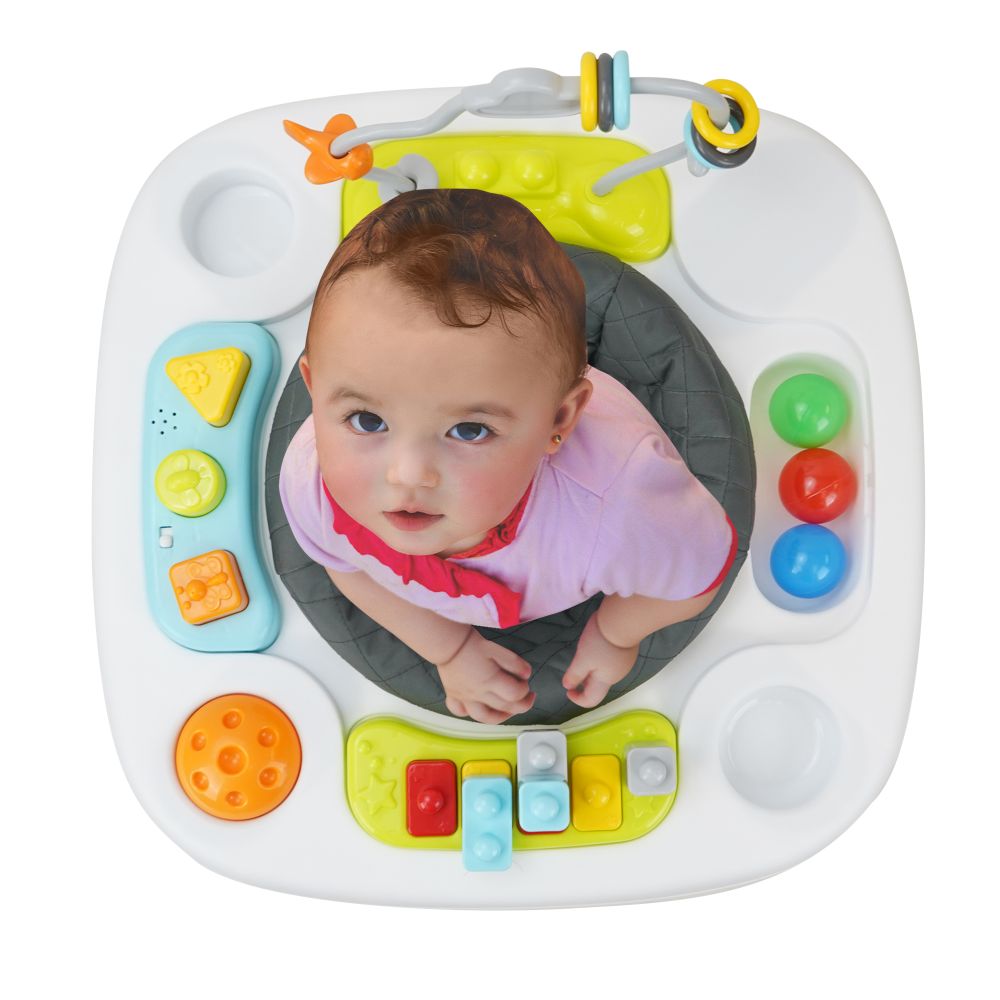Dítě poznává svět vsedě v sedadle. Hračky položené na stole se může dotýkat rukama a díky pohyblivé plošině procvičovat nohy.