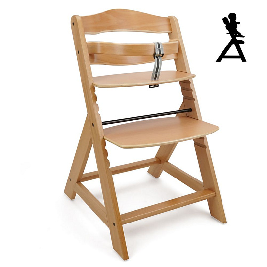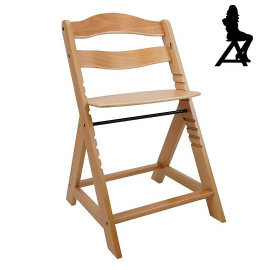 Dřevěná vysoká židlička, která roste spolu s dítětem. Včetně přední tyče a rozdělení rozkroku – u starších dětí lze sejmout a předělat na normální židli i pro dospělé. Vícestupňové nastavení výšky sedáku i opěrky nohou. Opěrku nohou je možné úplně demontovat.