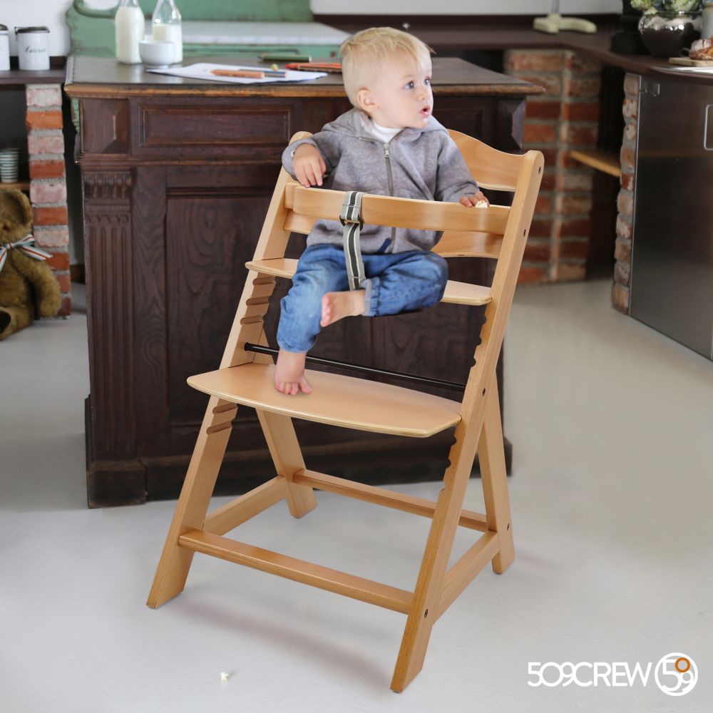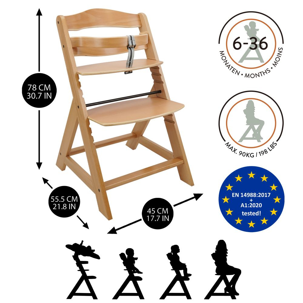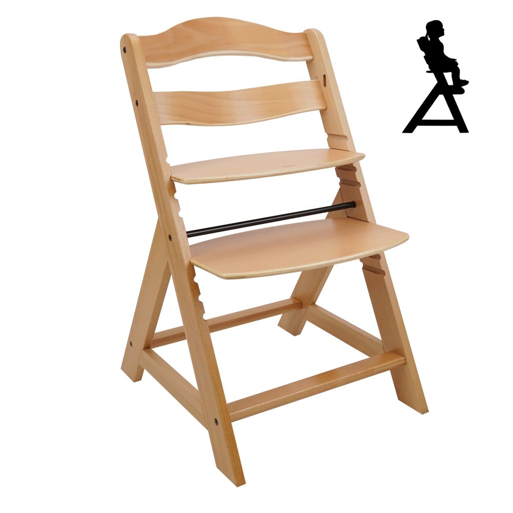 Dřevěná vysoká židlička, která roste spolu s dítětem. Včetně přední tyče a rozdělení rozkroku – u starších dětí lze sejmout a předělat na normální židli i pro dospělé. Vícestupňové nastavení výšky sedáku i opěrky nohou. Opěrku nohou je možné úplně demontovat.
