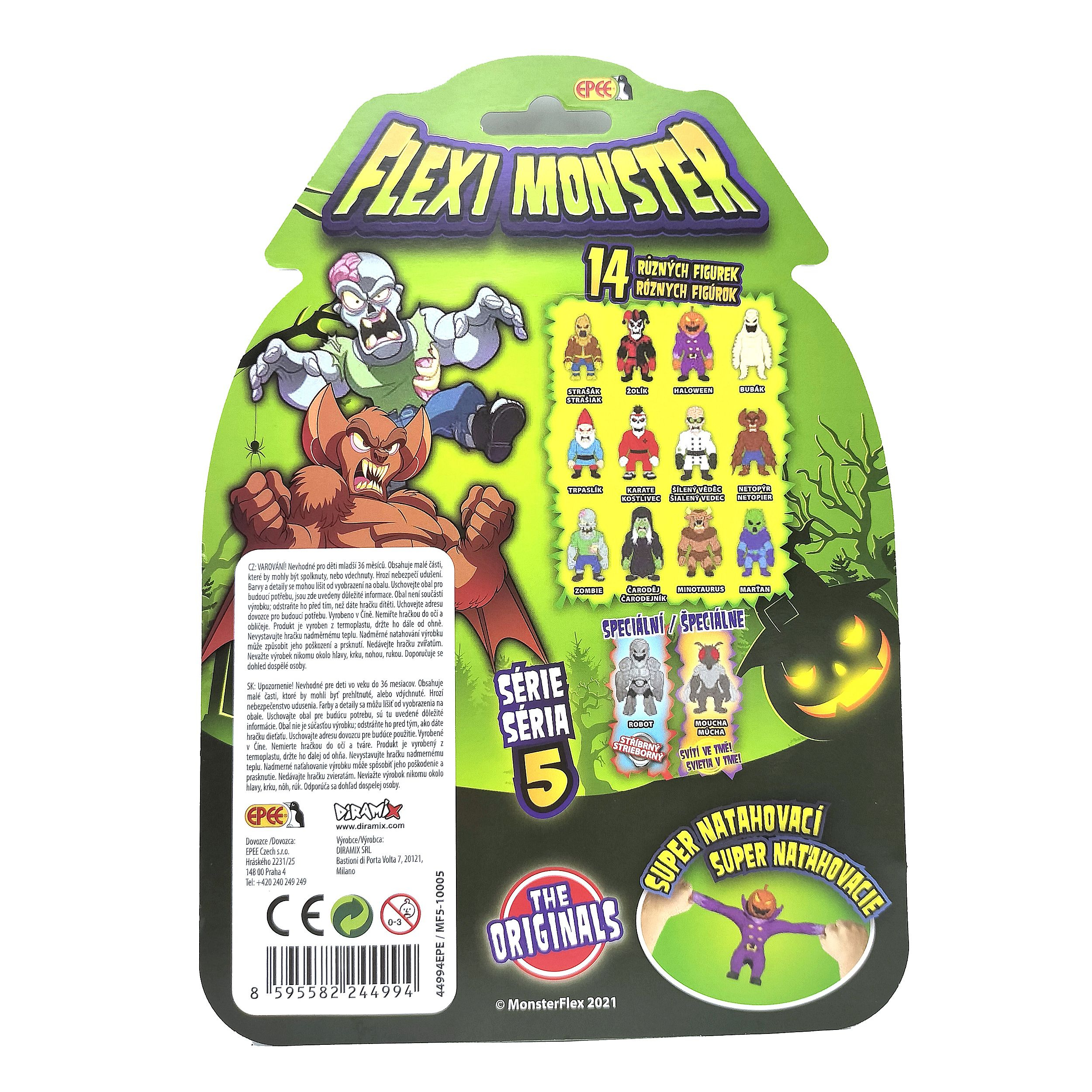 Flexi Monster serie 5 je tady! Na výběr máte ze 14ti různých strašidelných figurek. Natahujte je, roztahujte je, mačkejte je, proplétejte jim končetiny. Jsou odporní, jsou strašidelní, ale rozhodně vás nebudou nudit. Rozměry balení 16 x 23 x 5 cm. Vhodné pro děti od 3 let.