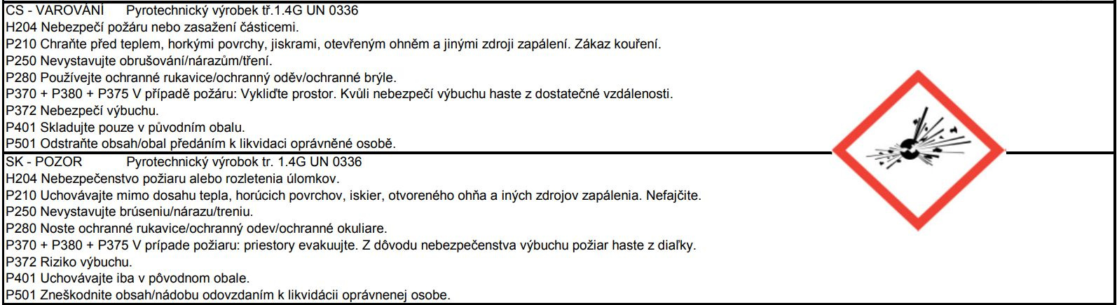 Jedno balení obsahuje 3 kusy zlaté párty fontány o délce 12 cm s držákem na láhev. Žádná párty se neobejde bez těchto párty fontán! Párty fontána dokonale nahradí svíčky na dortu. Pomocí plastového podstavce snadno a bezpečně zapíchnete do dortu. Díky originálními držáku na láhev, fontánu můžete snadno umístit pomocí držáku na hrdlo láhve. Fontánka po zapálení prská jako prskavka což vytváří nezapomenutelný efekt pro předávání sladké dobroty oslavenci. Délka trvání efeku: cca 40 sec. CLP – Třída nebezpečnosti. H204 Nebezpečí požáru nebo zasažení částicemi. P210 Chraňte před teplem, horkými povrchy, jiskrami, otevřeným ohněm a jinými zdroji zapálení. Zákaz kouření. P250 Nevystavujte obrušování/nárazům/tření. P280 Používejte ochranné rukavice/ochranný oděv/ochranné brýle. P370 + P380 + P375 V případě požáru: Vykliďte prostor. Kvůli nebezpečí výbuchu haste z dostatečné vzdálenosti. P372 Nebezpečí výbuchu. P401 Skladujte pouze v původním obalu. P501 Odstraňte obsah/obal předáním k likvidaci oprávněné osobě. CS – VAROVÁNÍ Pyrotechnický výrobek tř.1.4G UN 0336.
