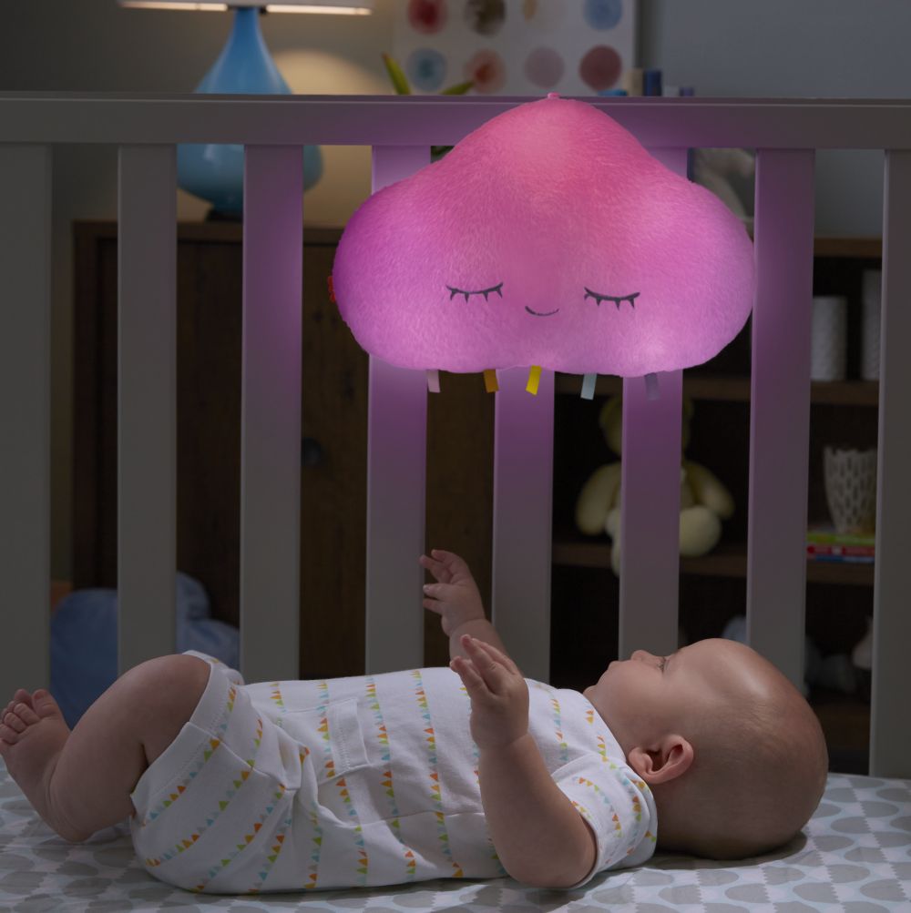 Uspávací hračka Fisher-Price®, kterou lze přichytit k postýlce, je vyrobená z měkkých látek s několika barevnými světýlky vytvářejícími podmanivou uklidňující světelnou podívanou. Děťátko se uspává nejdříve během 10 minut světelných efektů doprovázených hudbou. Světýlka se poté vypnou a děťátko poslouchá dalších 10 minut hudební produkce, která mu pomůže přejít do říše snů. Obláček je možné snadno přichytit k téměř jakékoli postýlce. Můžete si ho navíc vzít kdykoliv s sebou! Ovládání na zadní straně umožňuje rodičům vybrat tu správnou písničku, oblíbené barvy dítěte a různé světelné efekty. Jako třešnička na dortu nakonec jsou na obláčku barevné stužky, které dokonale poslouží při objevování světa kolem miminka.