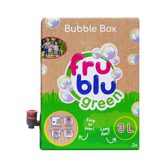 Bubble Box je inovativní přístup do světa duhových bublin, který spojuje skvělou zábavu s důrazem na ekologii a pohodlí při používání. Navíc je každý komponent Bubble Box recyklovatelný. Naše obaly jsou šetrné k životnímu prostředí a snadnost recyklace znamená, že se můžete hrdě zúčastnit ekologické bublinkové zábavy. Poznejte Bubble Box: - 3l tekutiny zaručí dlouhotrvající zábavu - díky velké zásobě tekutiny je zábava nekonečná!Snadné nalévání a prodloužená skladovatelnost tekutiny: jedinečný systém balení zajišťuje pohodlné použití a prodlouženou trvanlivost tekutiny. Použitý typ ventilu se nejčastěji používá v balení Bag-in-Box® díky své výjimečné kvalitě, tj. nízké míře úniku produktu (méně než 1 z 55 milionů balení). Pravděpodobnost rozlití tekutiny je mnohem nižší než u klasických lahví na tekutiny. To umožňuje prodloužit trvanlivost produktu. Rychlé a přesné nalévání kapaliny je nyní standardem! Vhodné také pro použití s ??dalšími produkty Fru Blu. Snadná recyklace a šetrnost k životnímu prostředí: záleží nám na budoucnosti, proto je každý komponent recyklovatelný. Použitý obal umožňuje igelitový sáček a kartonovou krabici od sebe oddělit a po použití vyhodit do příslušného kontejneru pro daný druh odpadu. Bag in box je řešení, které vám umožní efektivně snížit množství plastu použitého k balení tekutiny z bublin.Pohodlí - speciální otvory pro ruce umožňují snadné přenášení produktu. Bubble Box není jen zábava, je to inovativní revoluce ve světě bublin! Připojte se k n